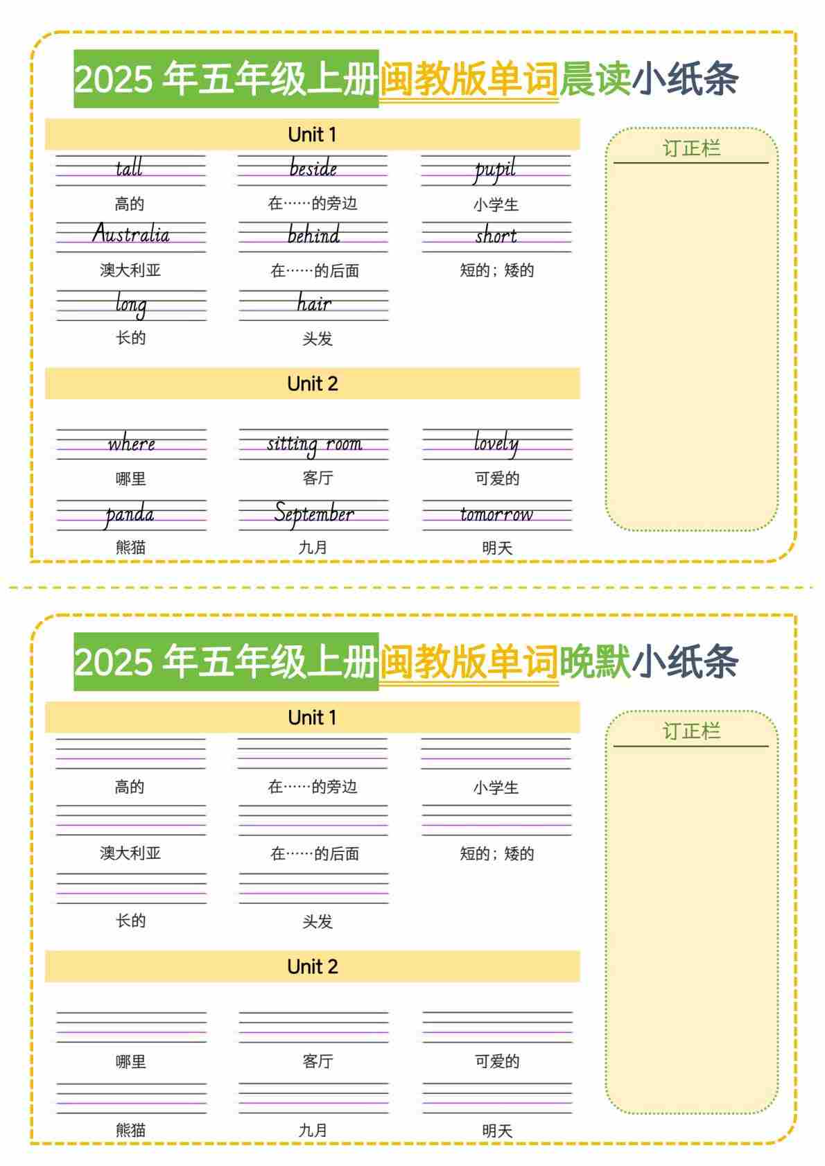 25五上英语闽教版晨读晚默小纸条
