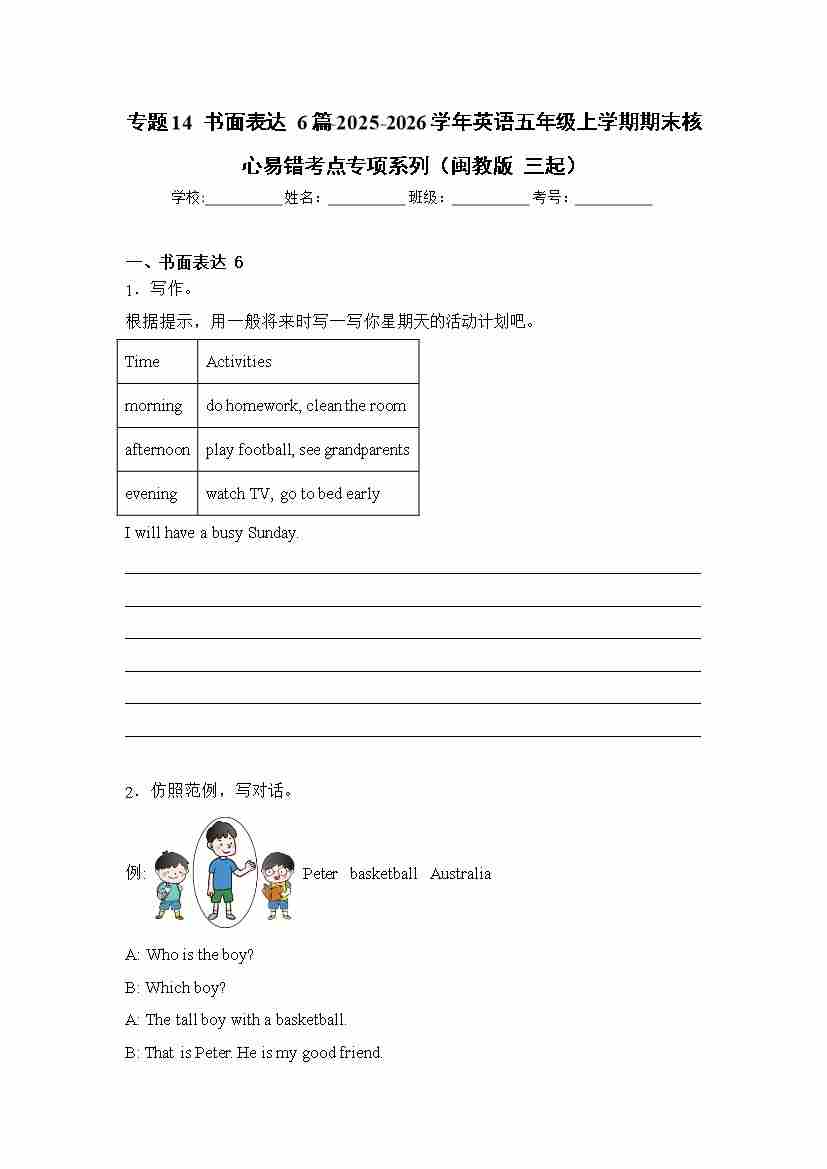 专题14 书面表达6篇-2025-2026学年英语五年级上学期期末核心易错考点专项系列(闽教版三起)