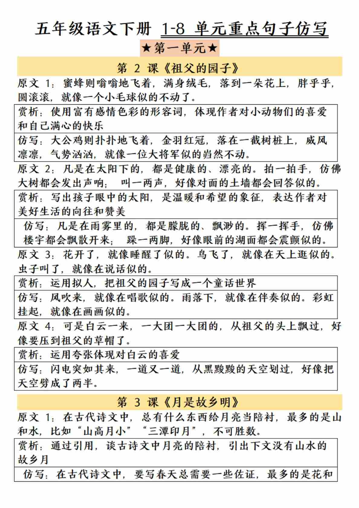 五年级(下)语文 1-8单元重点句子仿写