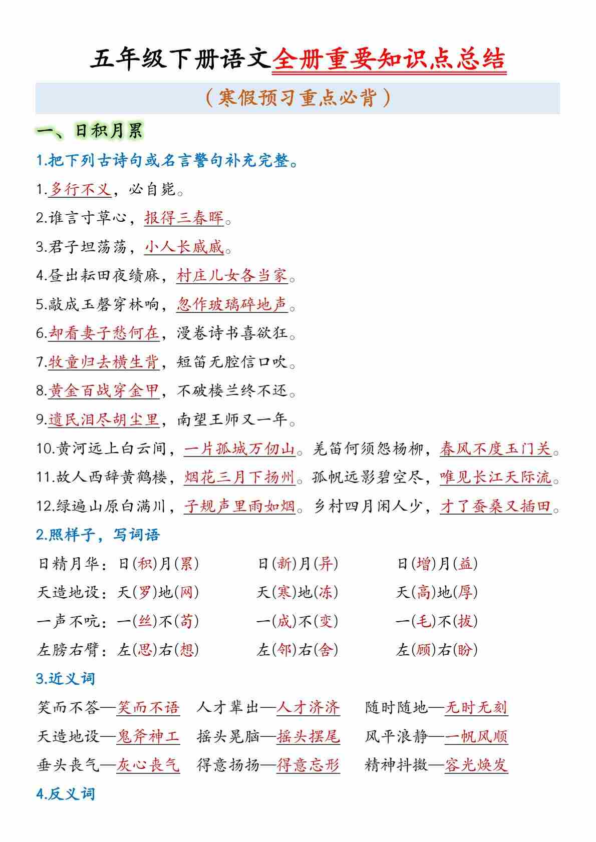 25春黄冈小状元寒假作业人教语文5上