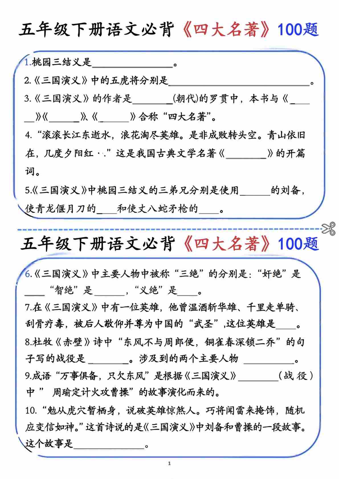 五年级(下)语文 必背《四大名著》100题