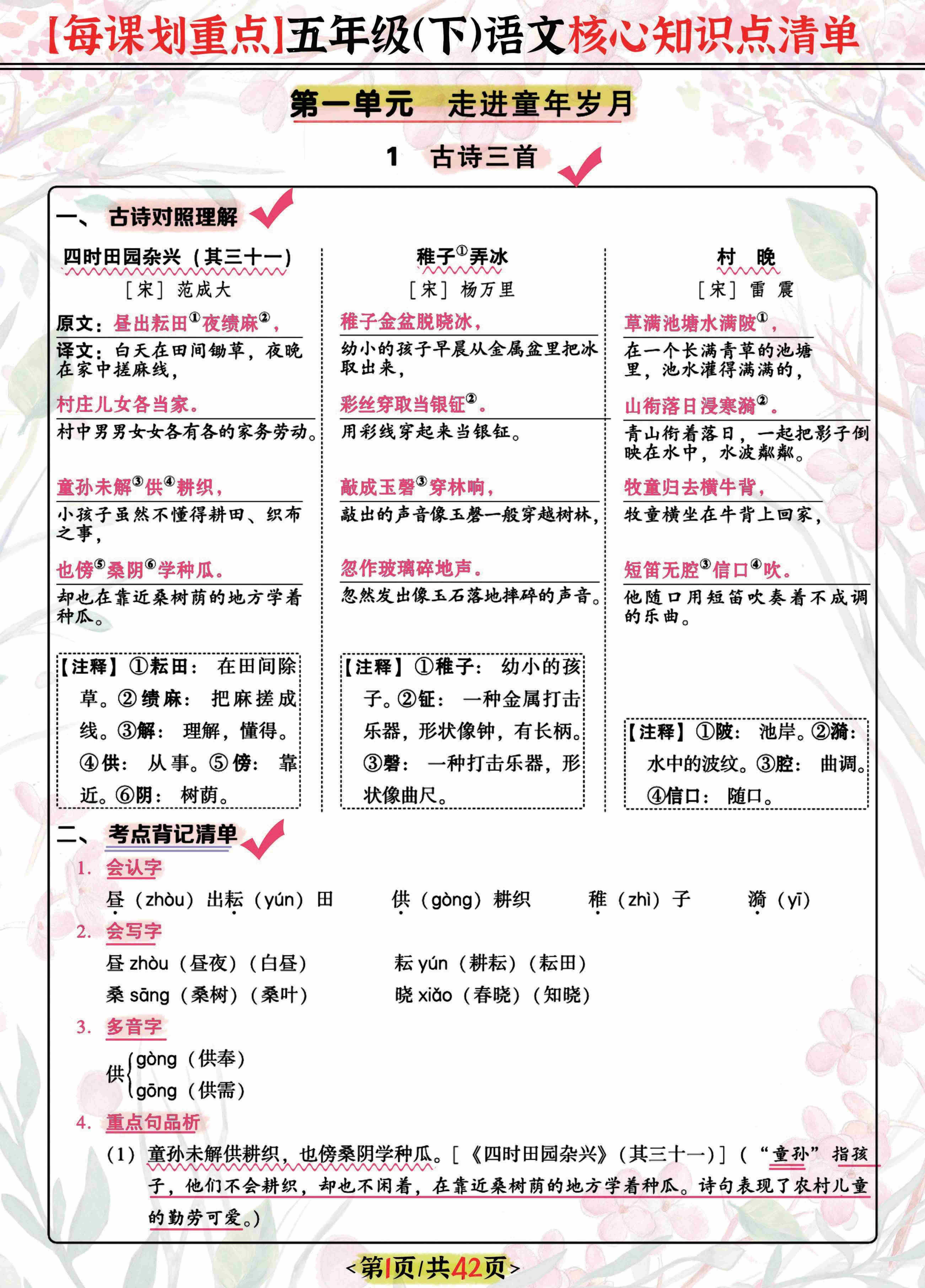 五年级(下)语文 重点笔记课课贴