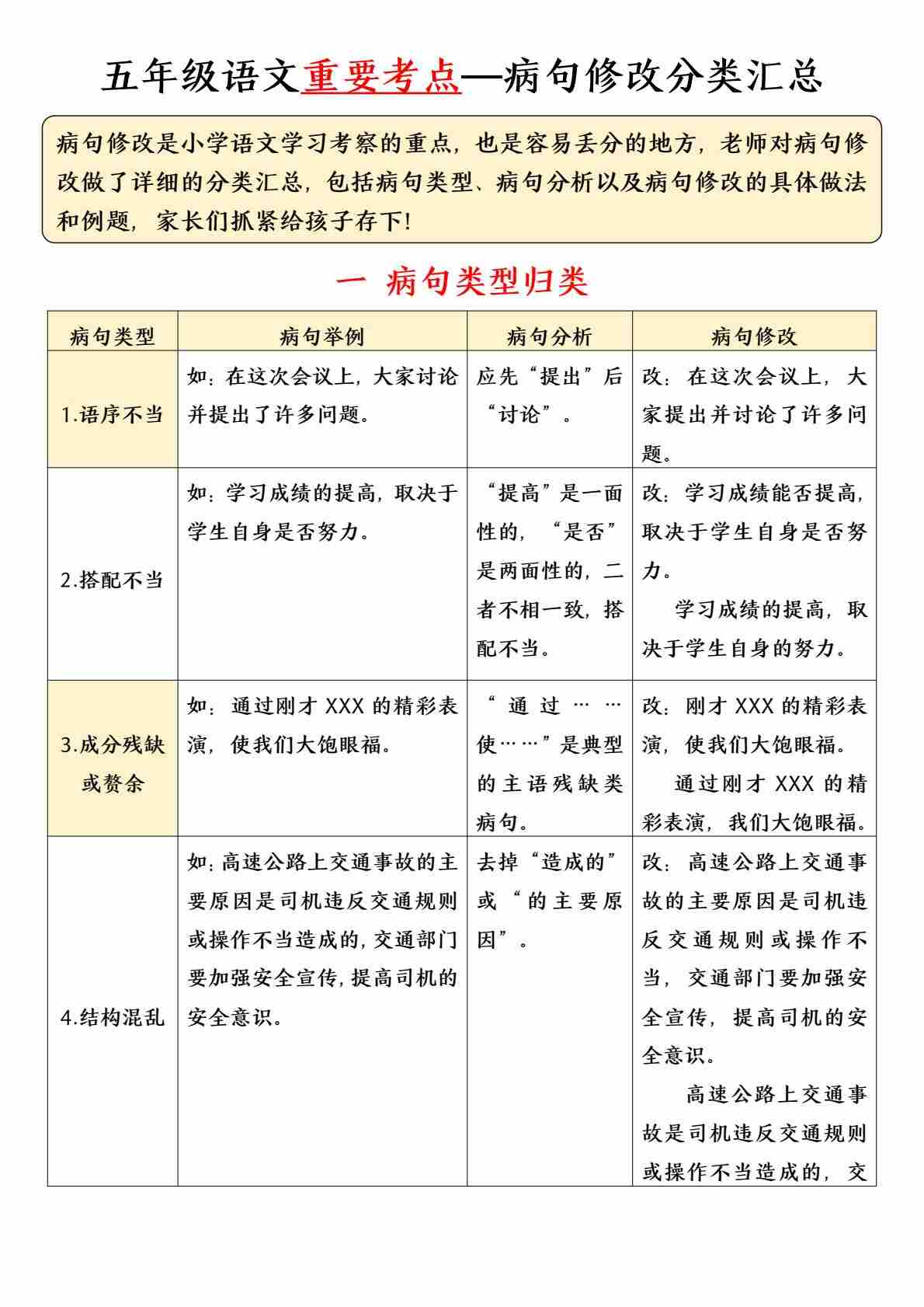 五年级(下)语文 病句修改专项练习