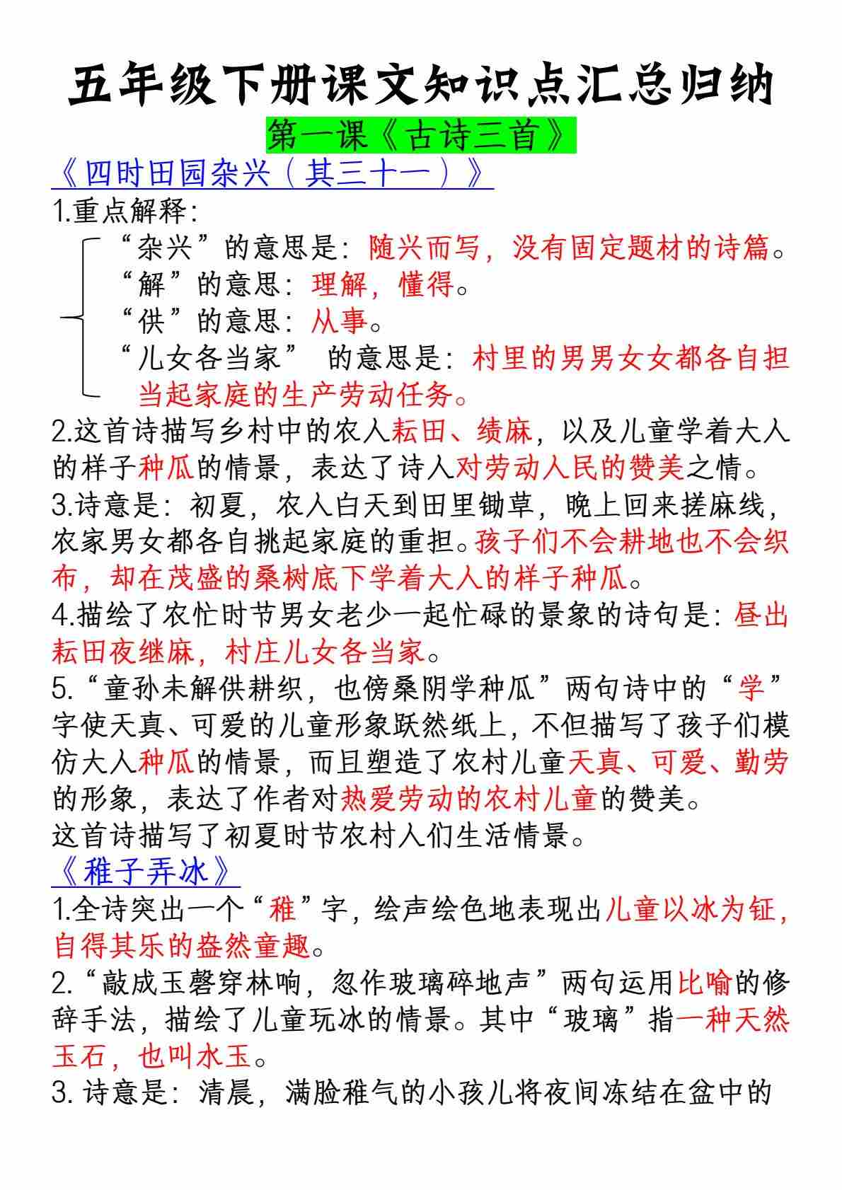 五年级(下)语文 课文知识点汇总归纳