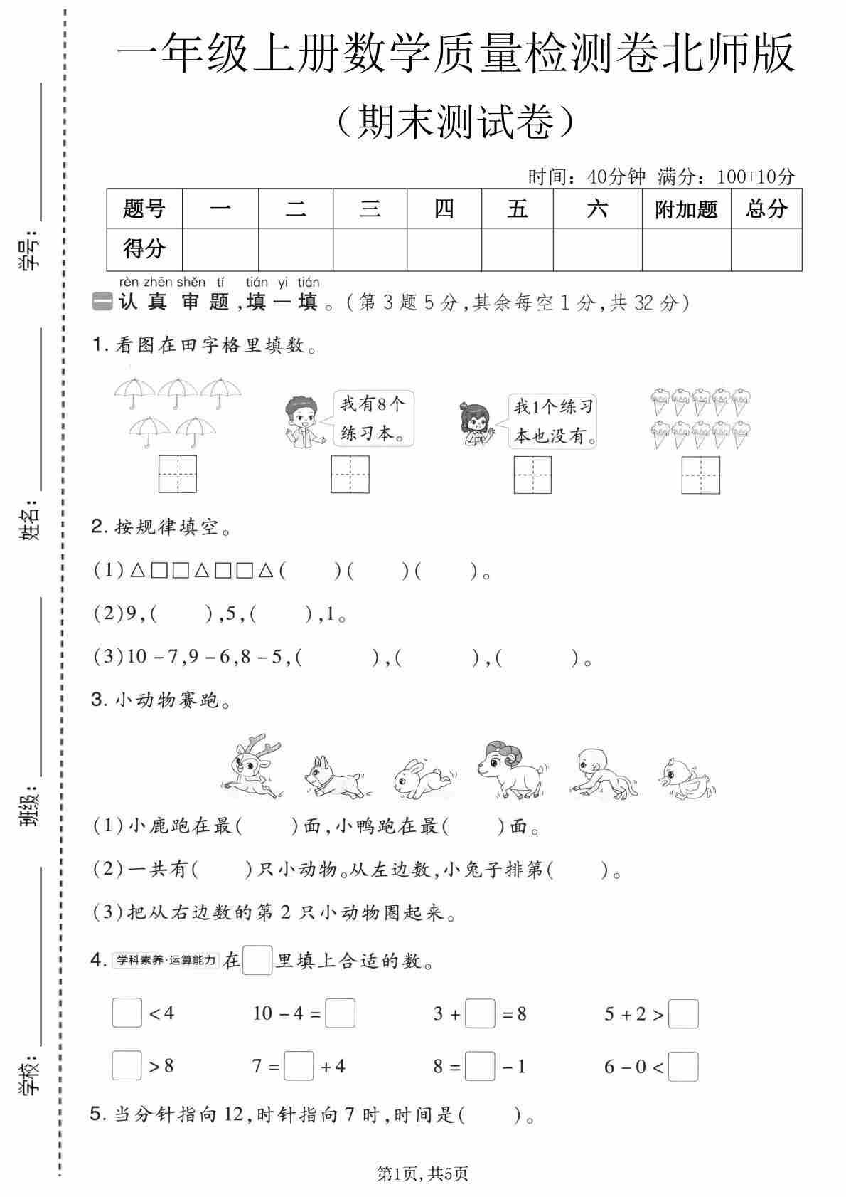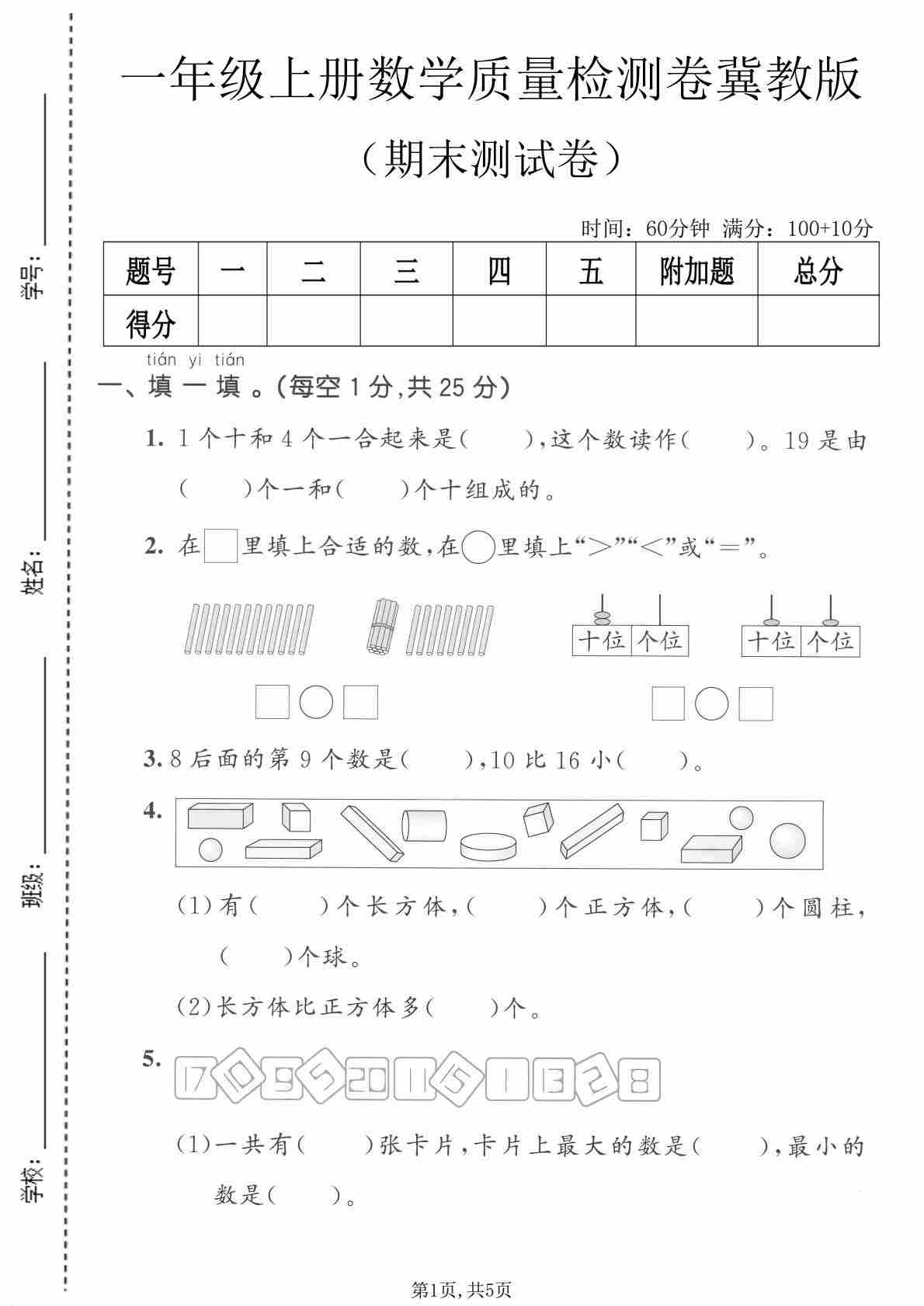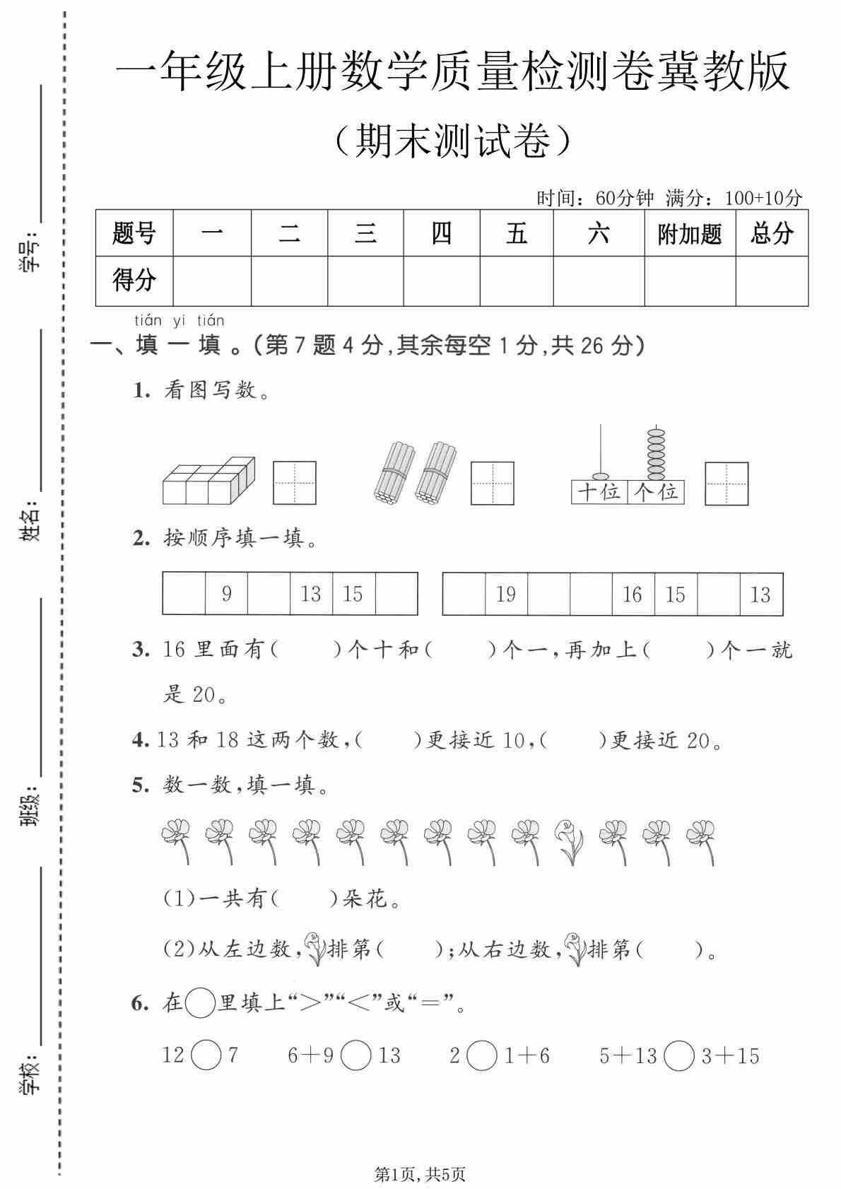 一年级(上)数学 期末质量检测卷1《冀教版》