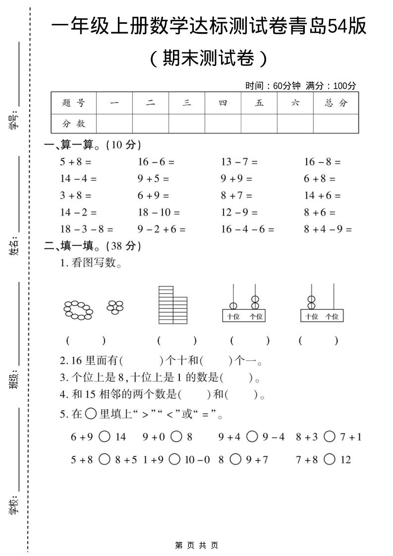 一年级(上)数学 期末达标测试卷1《青岛54版》