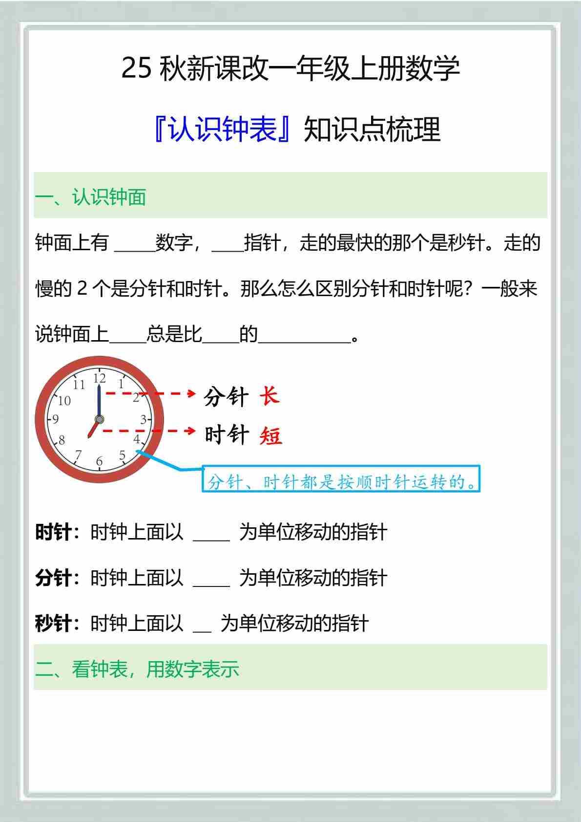 25秋新课改一年级(上)数学『认识钟表』知识点梳理