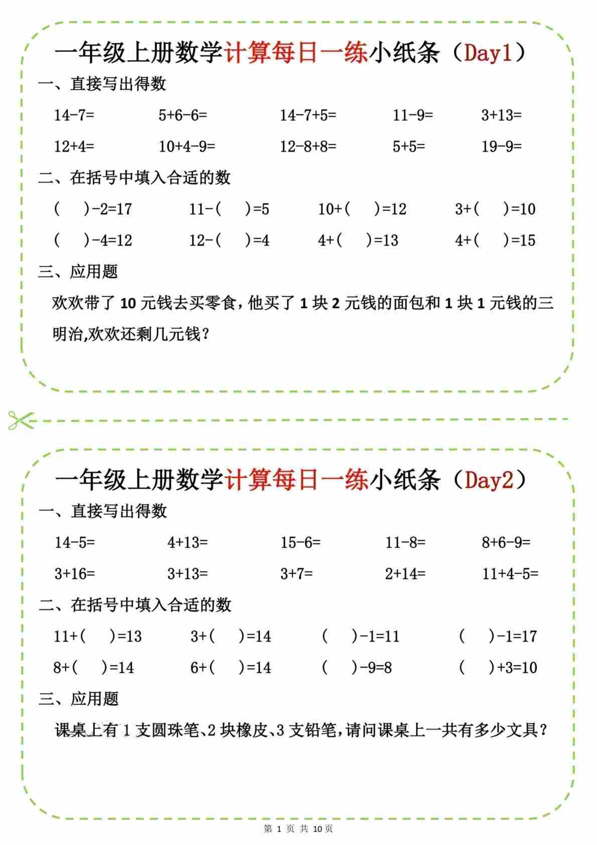 一年级(上)数学 计算每日一练小纸条20天