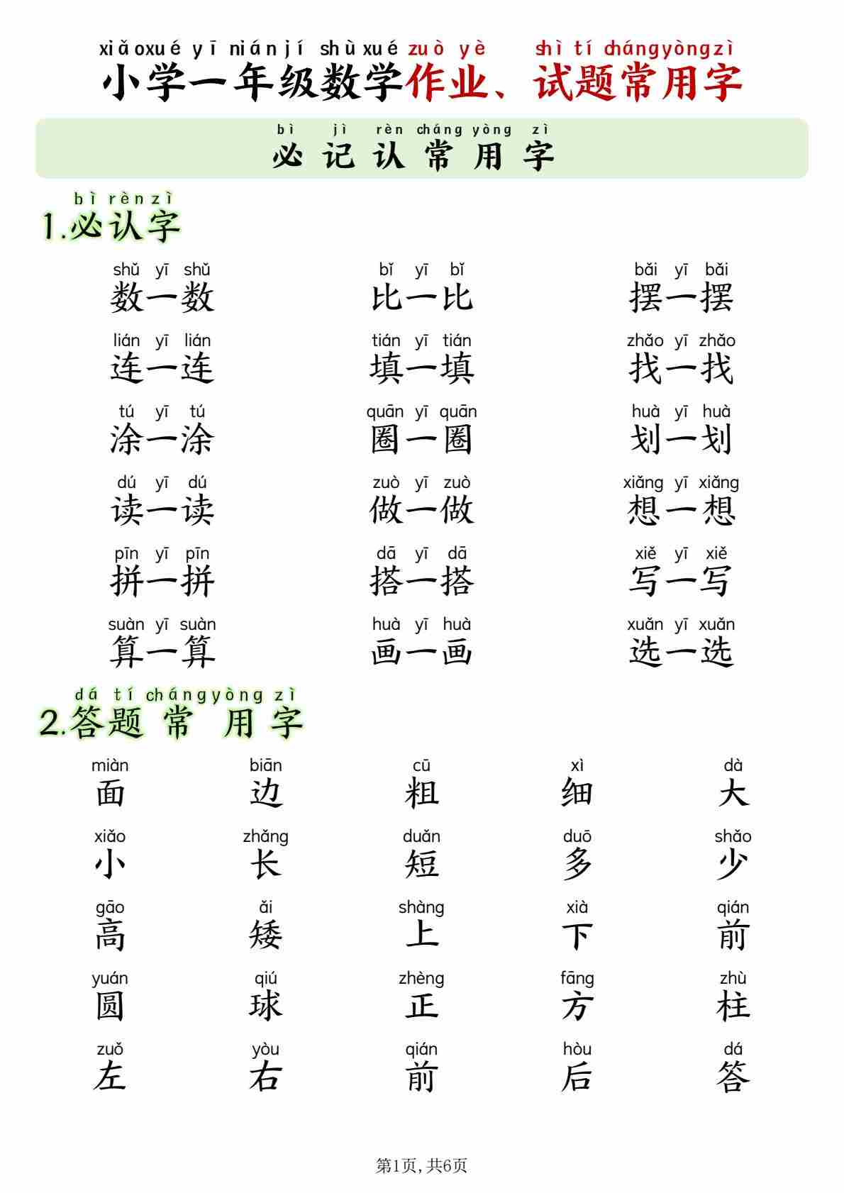 一年级(上)数学必记认常用字
