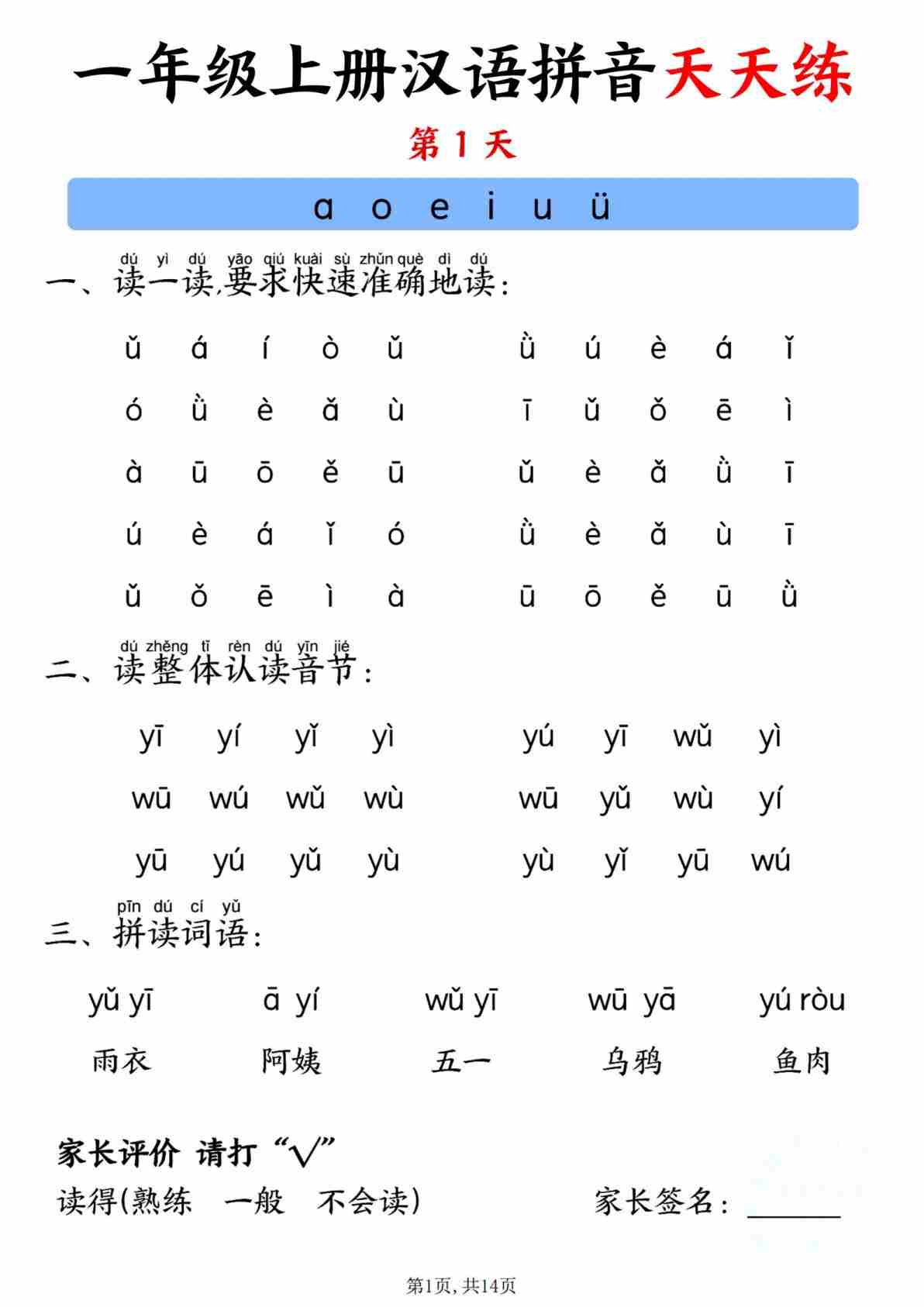 一年级(上)汉语 拼音天天练