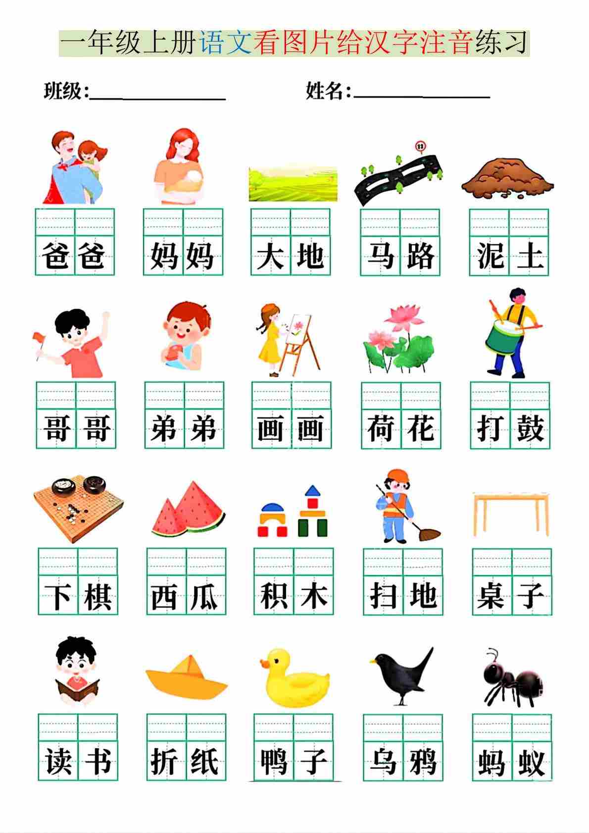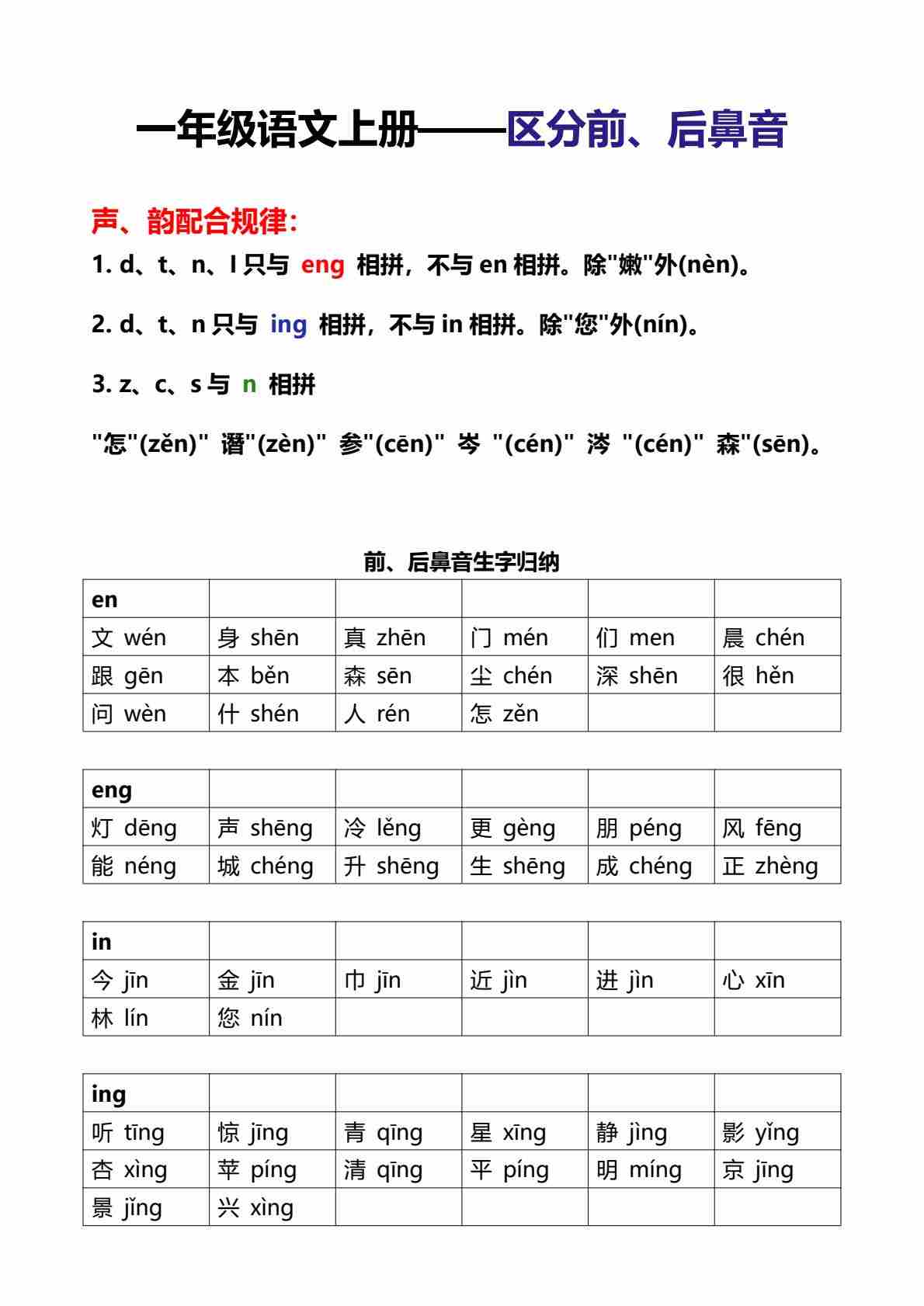 一年级(上)语文 区分前后鼻音专练