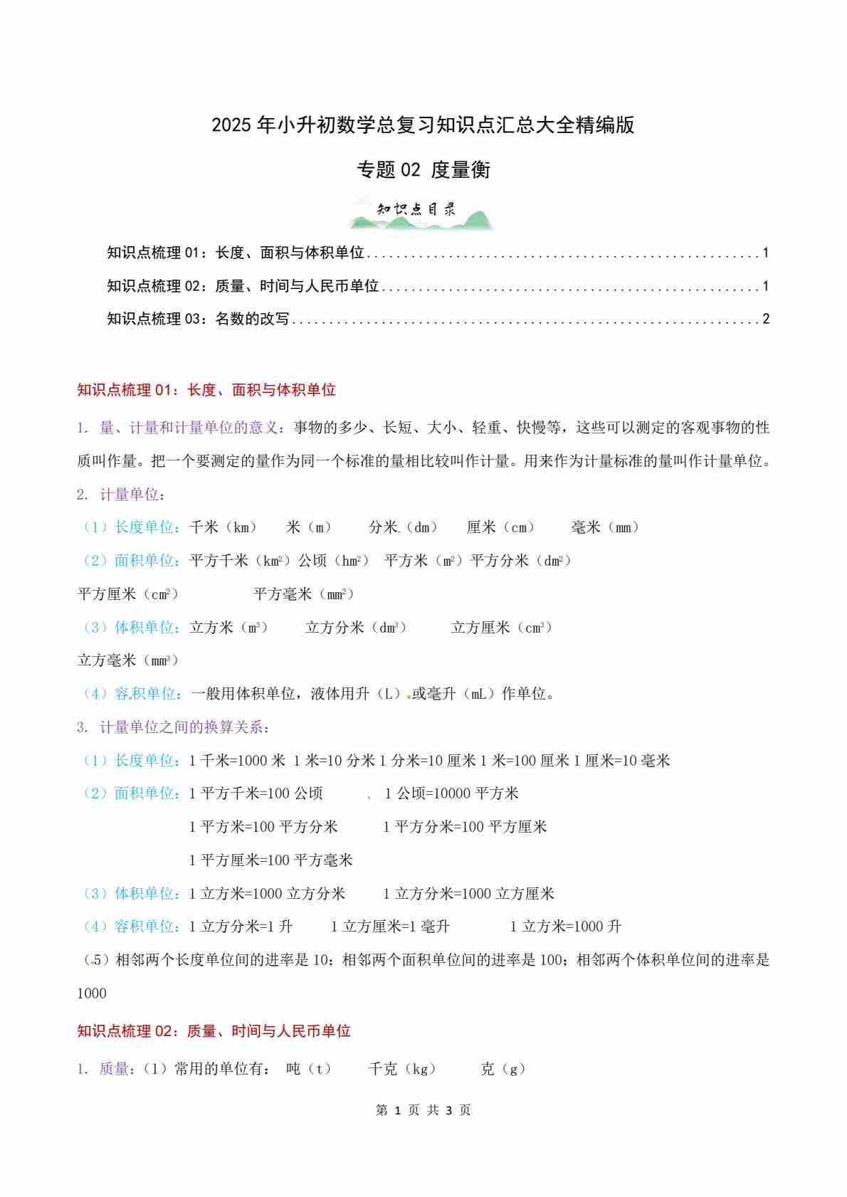专题02 度量衡-2025年小升初数学总复习知识点汇总大全精编版(纯知识点)
