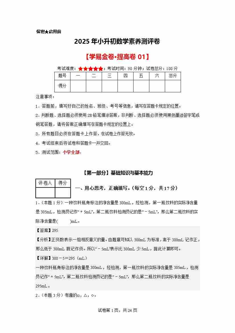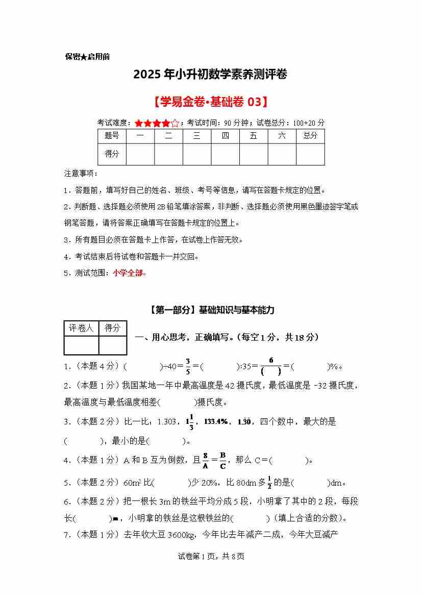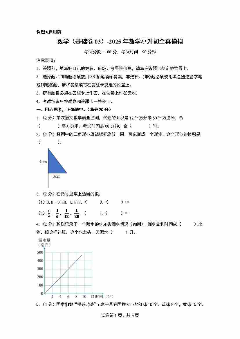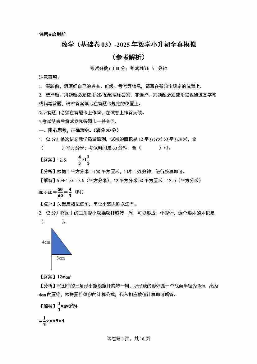 【A4考试版】数学(基础卷03)2025年小升初全真模拟(人教版)