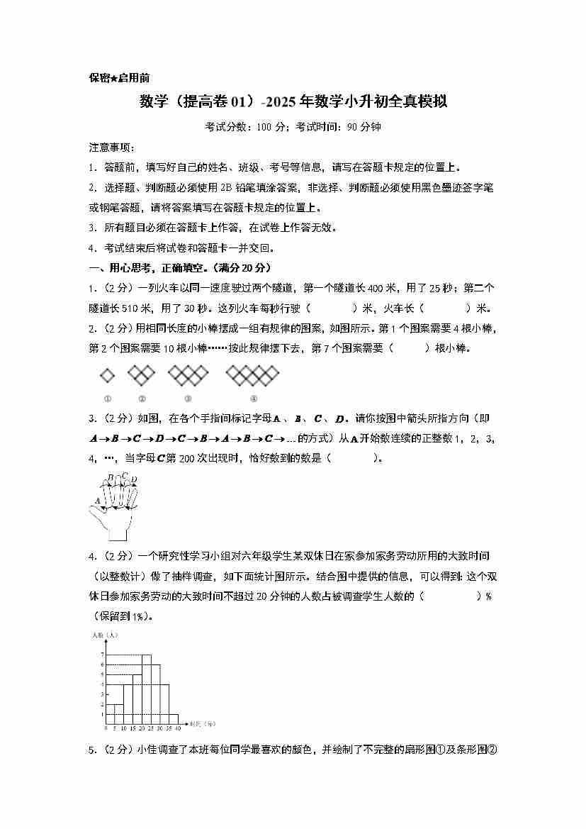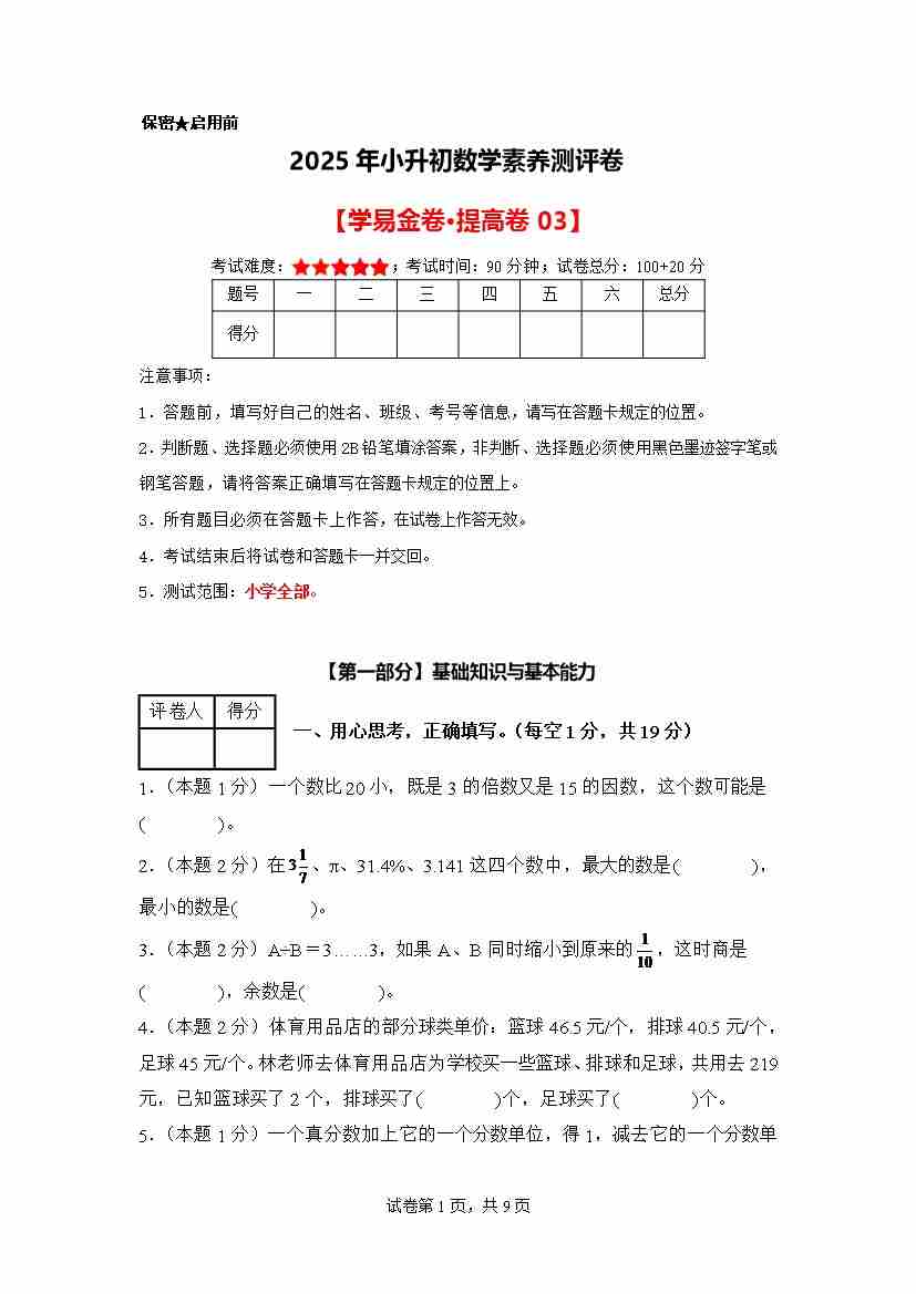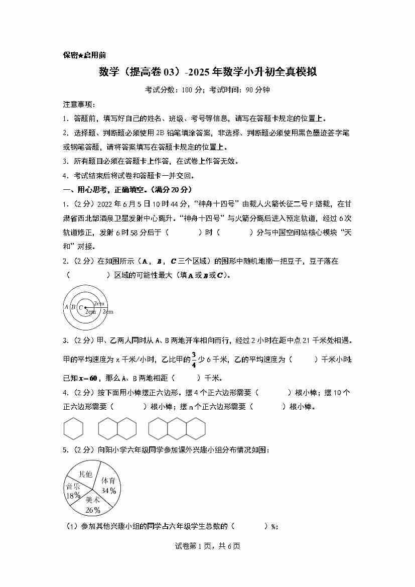 【A4考试版】数学(提高卷03)-2025年小升初全真模拟(人教版)