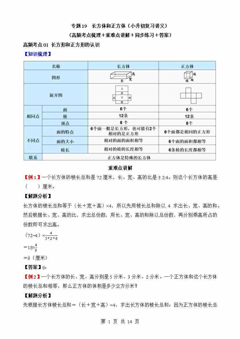 专题19 长方体和正方体(讲义)