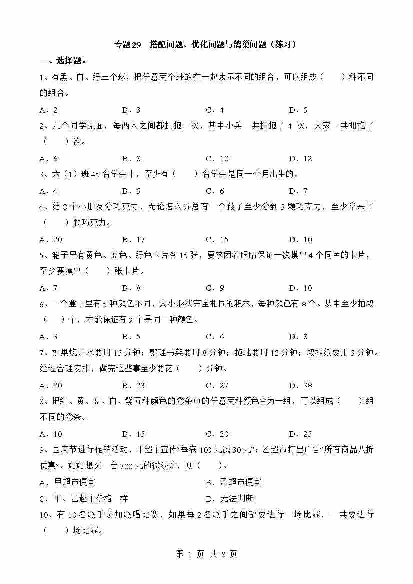 专题29 搭配问题、优化问题与鸽巢问题(练习)