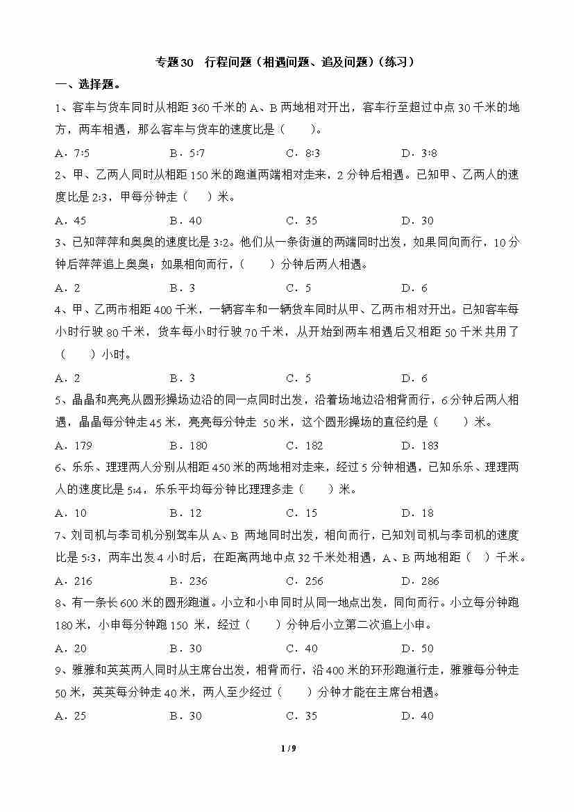 专题30 行程问题(相遇问题、追及问题)(练习)