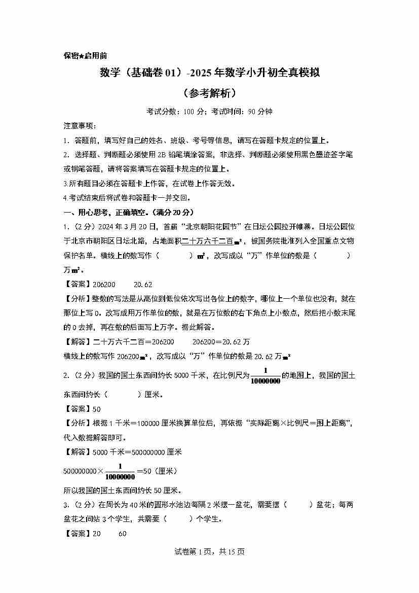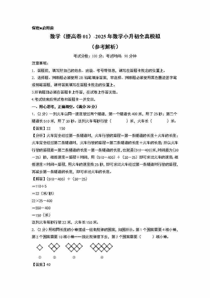 【参考解析】数学(提高卷01)-2025年小升初全真模拟(人教版)