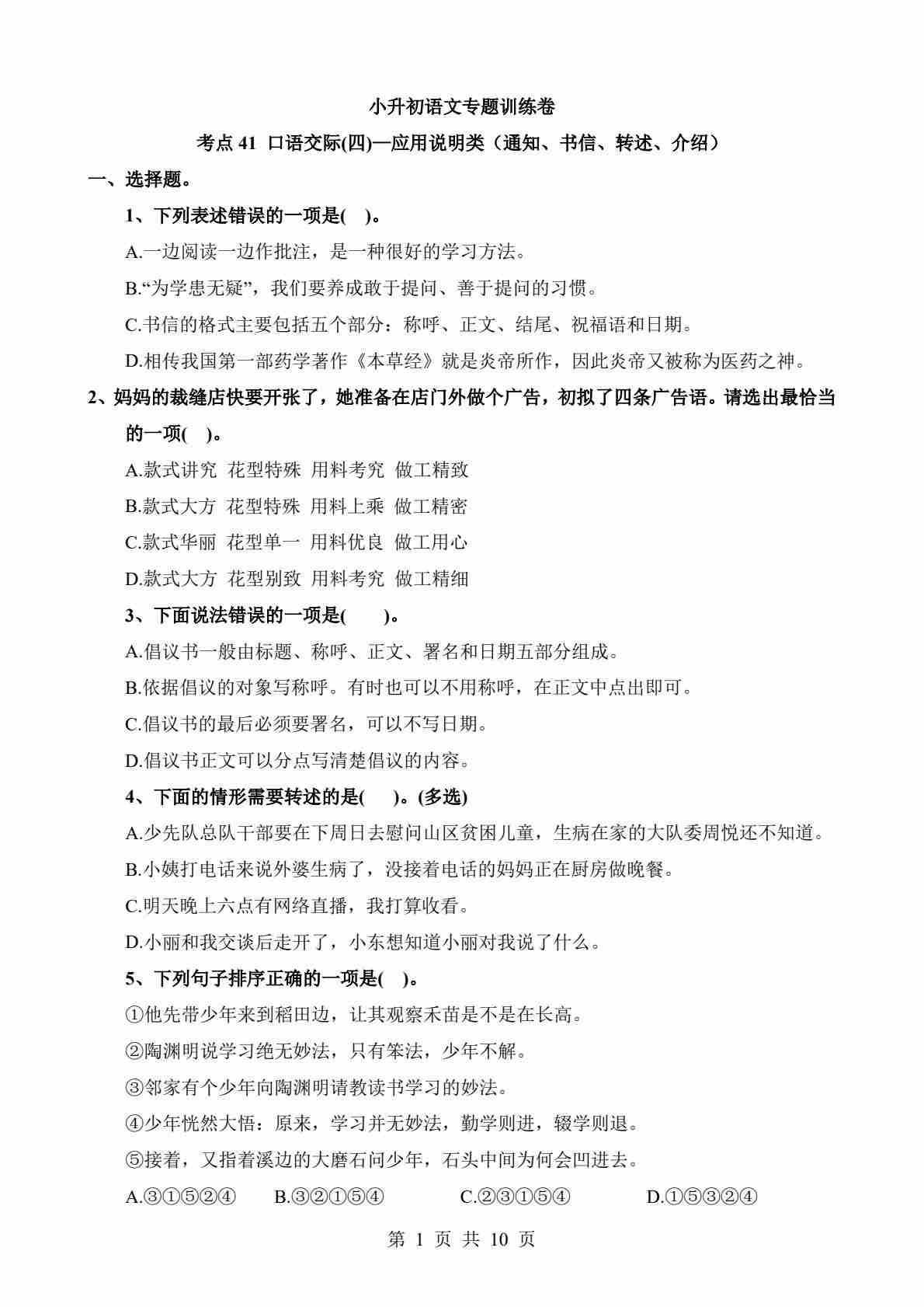 考点41 口语交际-应用说明类(通知、书信、转述、介绍)