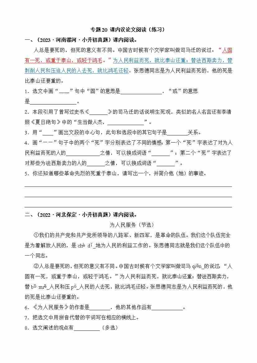 专题20 课内议论文阅读(练习)