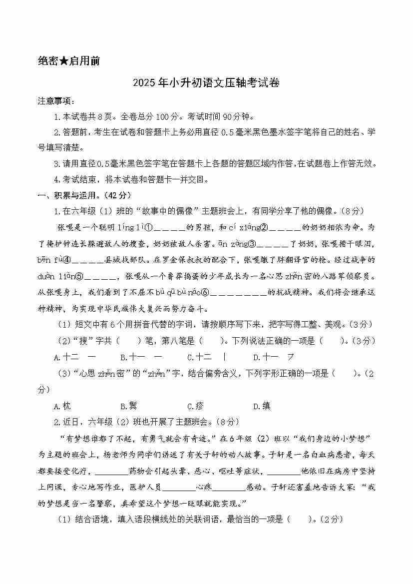 语文(压轴卷)(考试版A4)