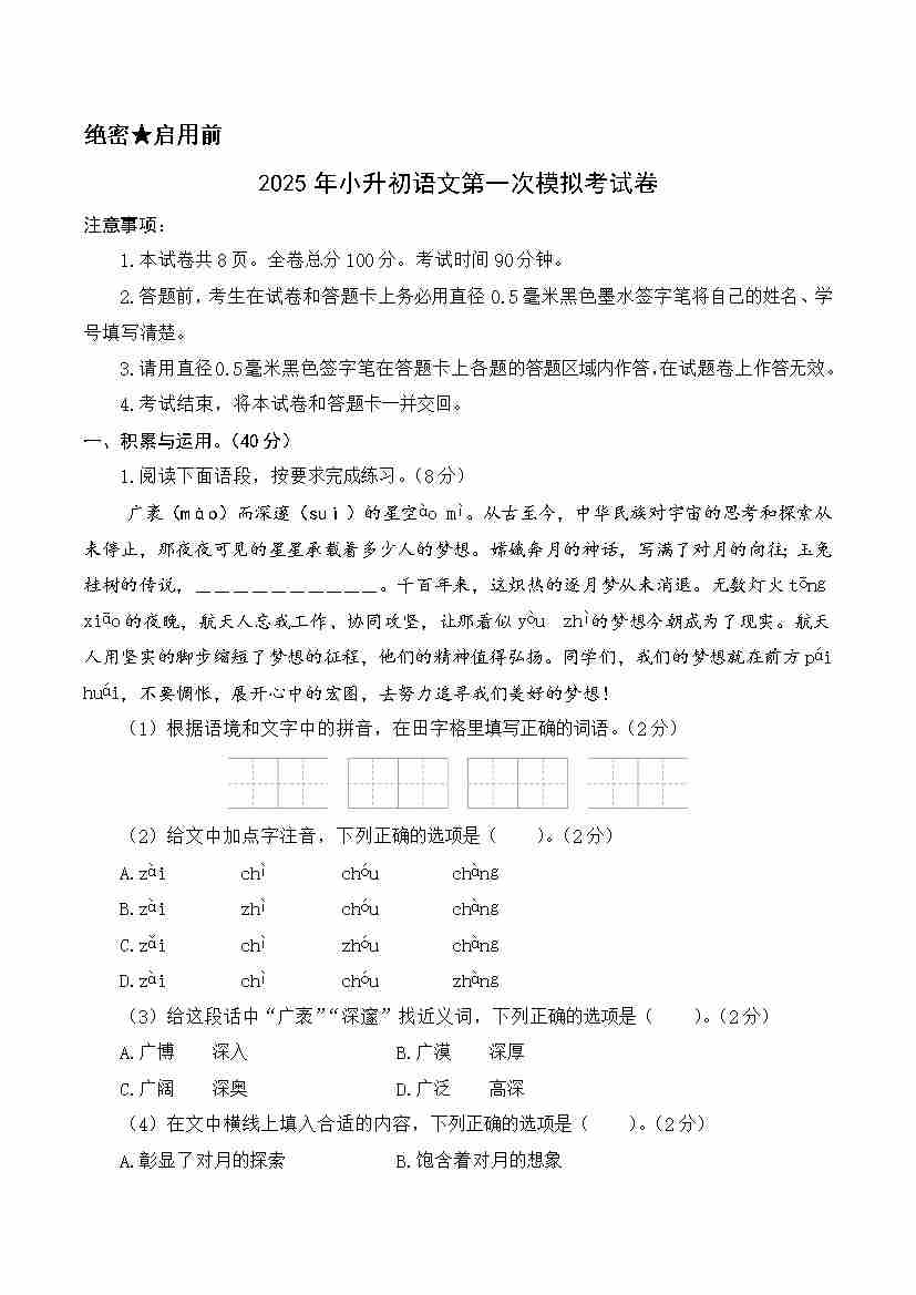 语文(基础卷01)(考试版A4)