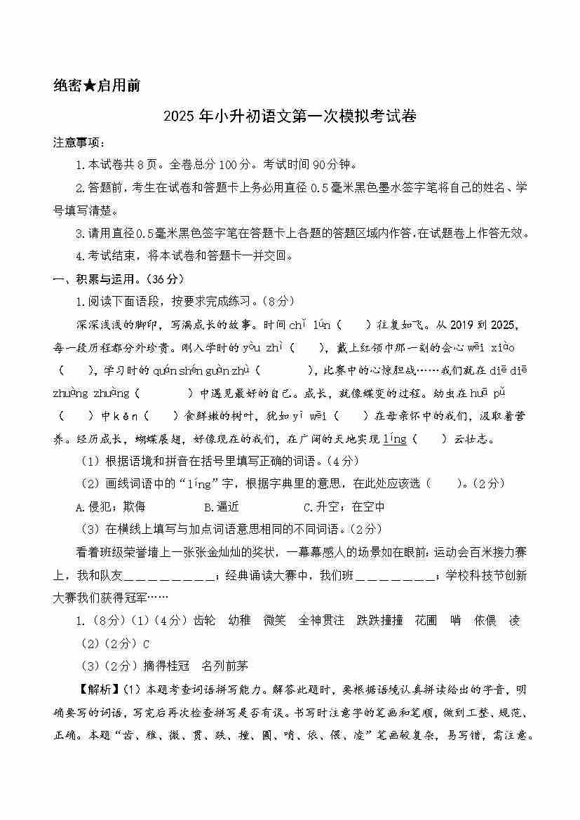 语文(提高卷01)(参考解析)