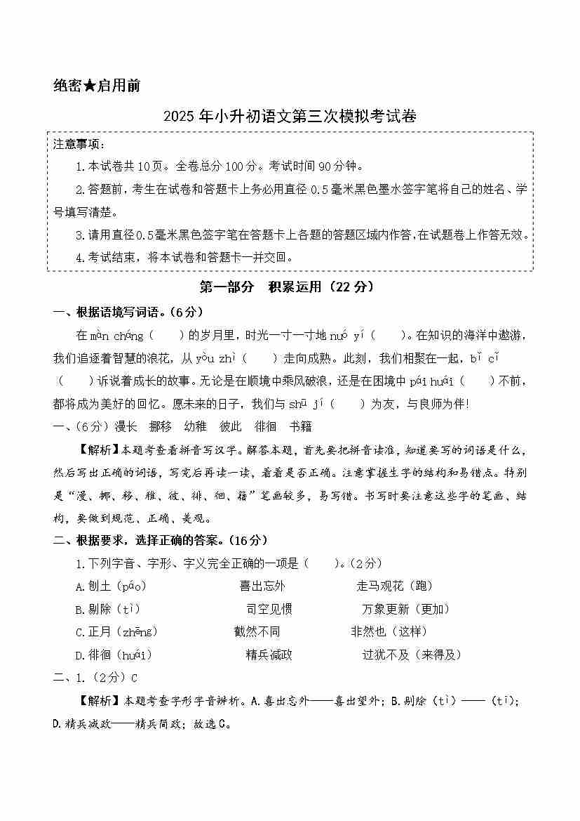 语文(基础卷01)(参考解析)12