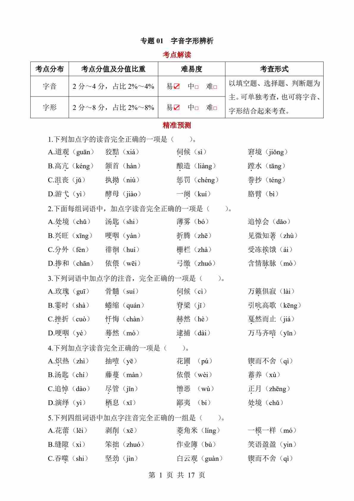 专题01 字音字形辨析