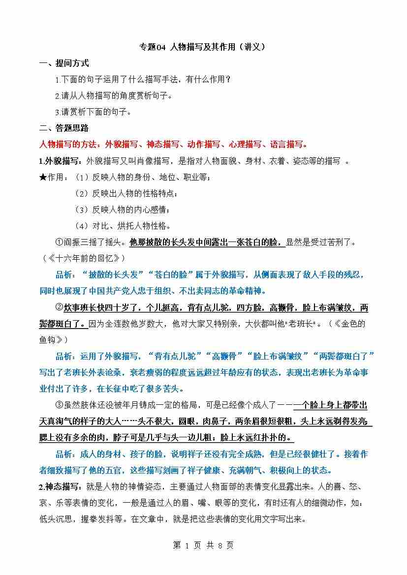 专题04 人物描写及其作用(讲义)
