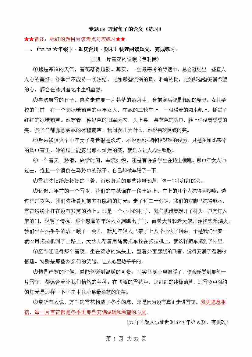 专题09 理解句子的含义(练习)