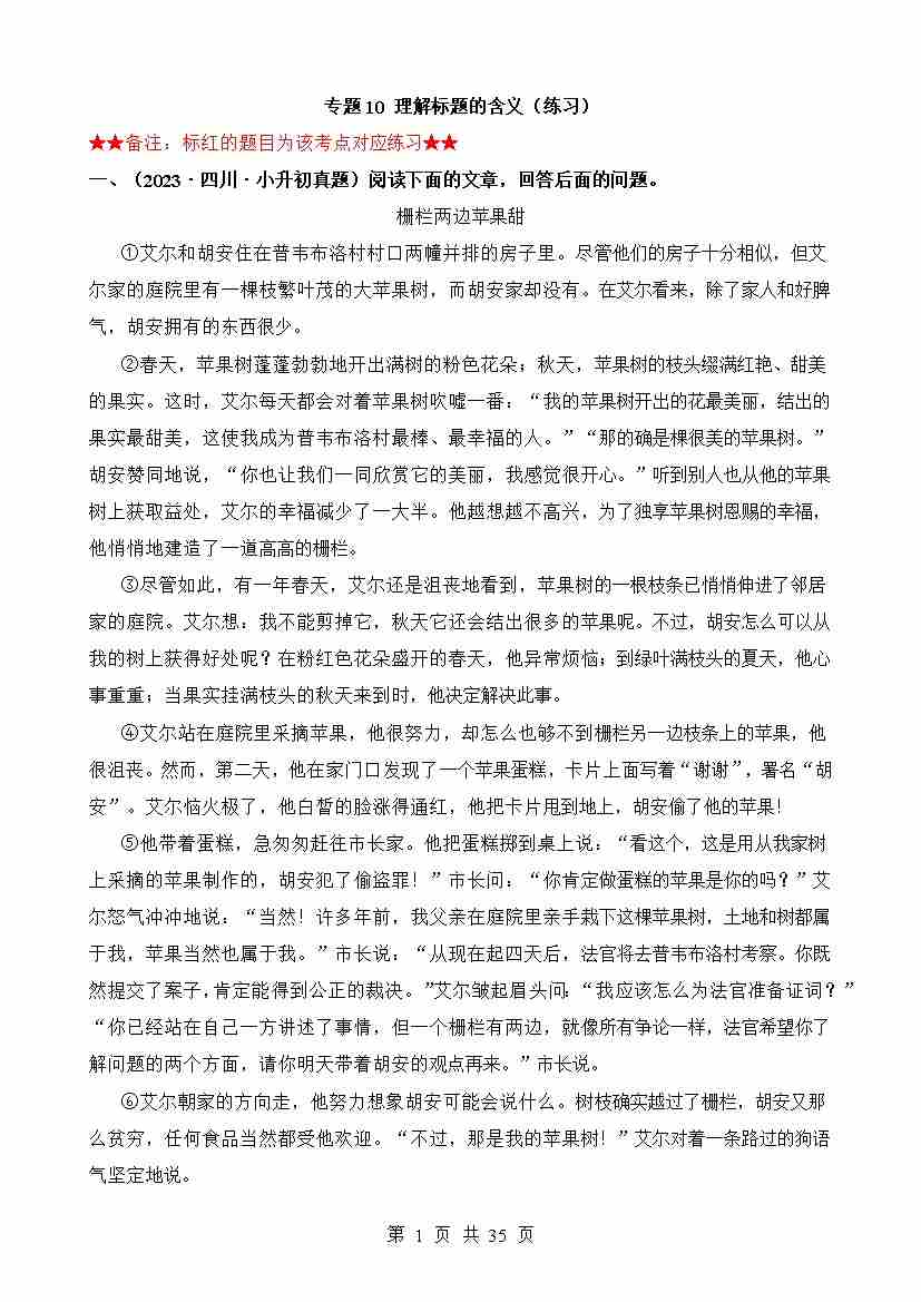 专题10 理解标题的含义(练习)