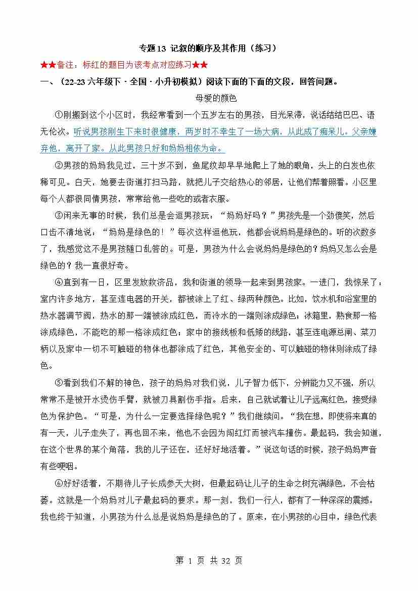 专题13 记叙的顺序及其作用(练习)