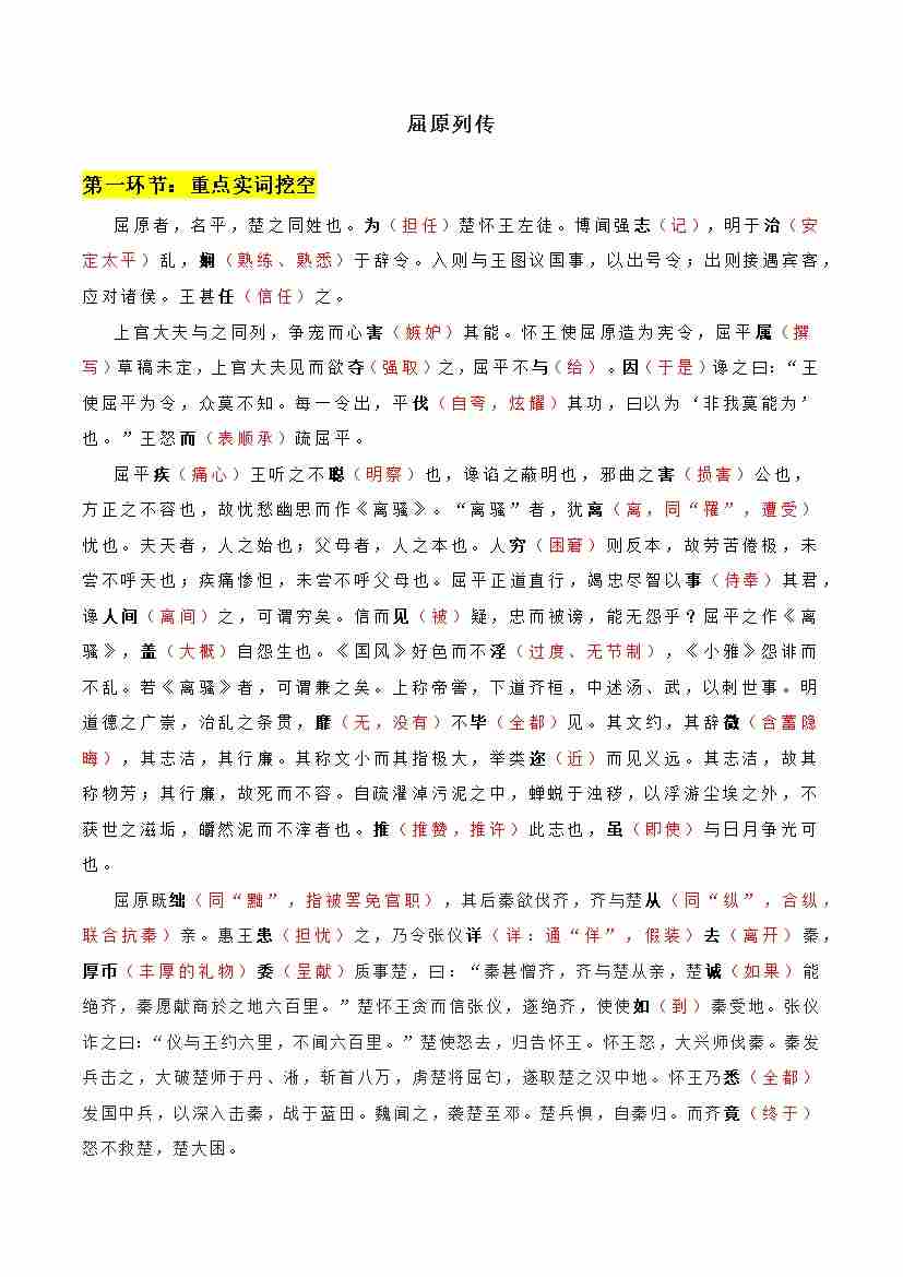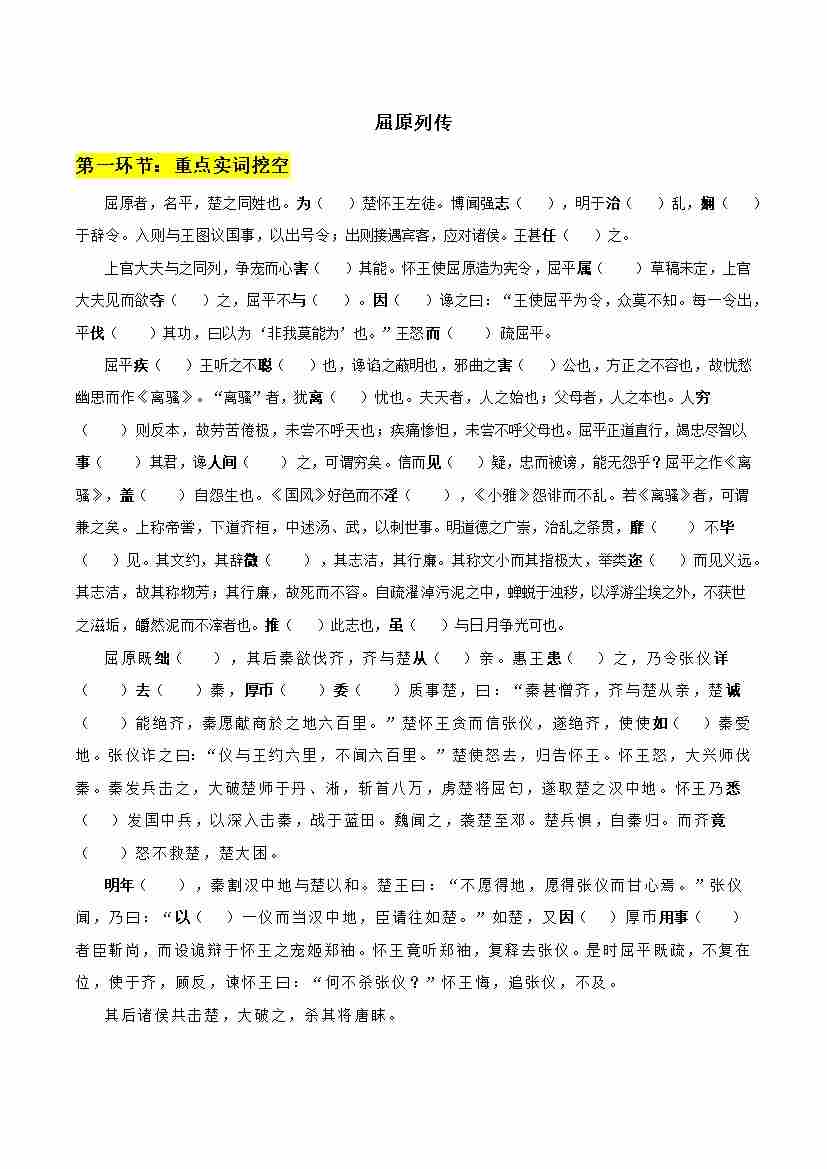 专题09 屈原列传、苏武传(文言文挖空训练)(全国通用)(学生版)