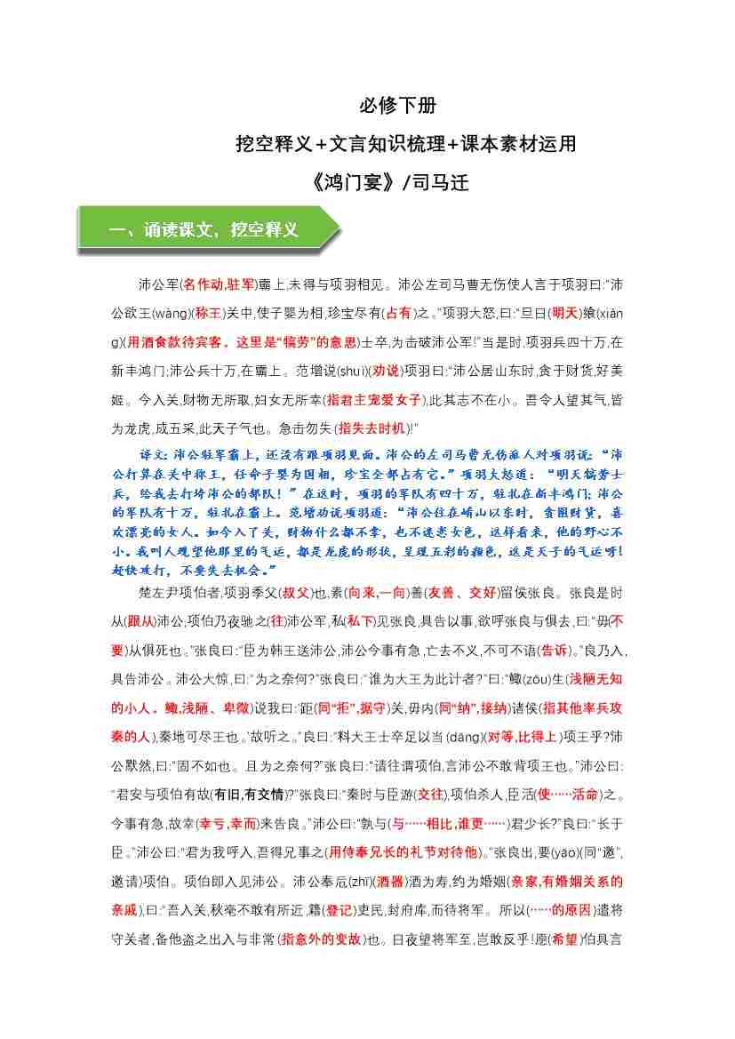 《鸿门宴》文言知识梳理与写作取材(教师版)-13页