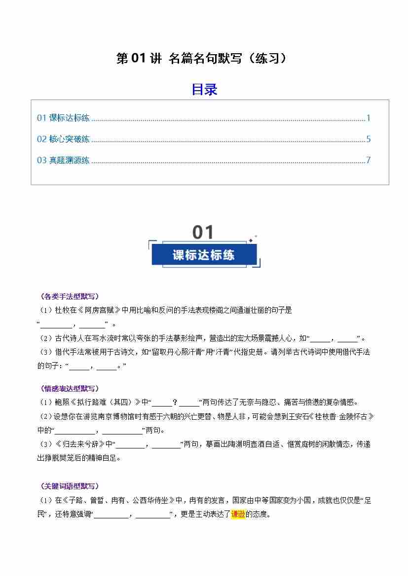 第01讲 名篇名句默写(专项训练)(全国通用)(学生版)
