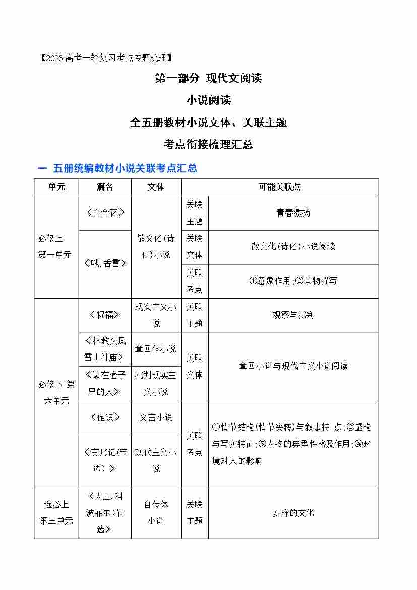 03 高考语文全五册教材小说文体、关联主题考点衔接梳理汇总(小说部分)-(全国通用)
