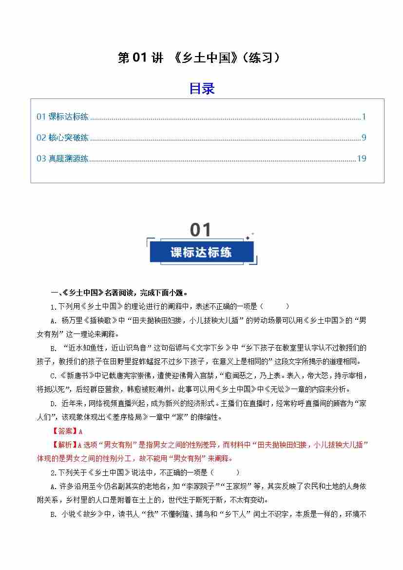 第01讲 《乡土中国(练习)(学生版)