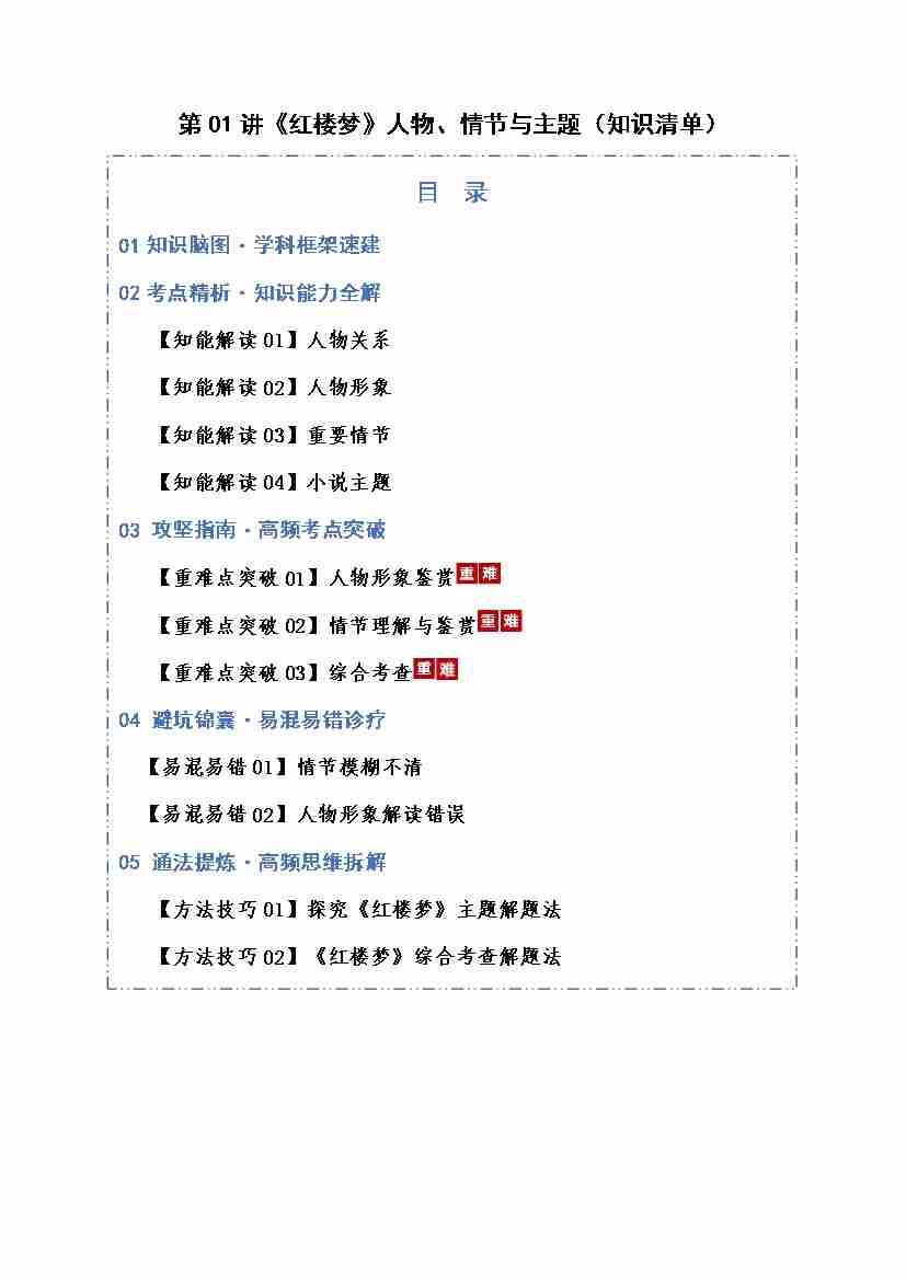 第01讲《红楼梦》人物、情节与主题(知识清单)(全国通用)教师版
