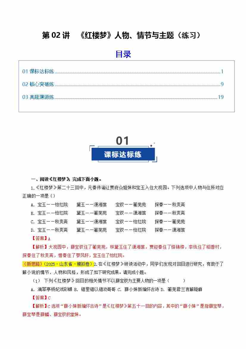 第02讲 《红楼梦》人物、情节与主题(练习)(教师版)