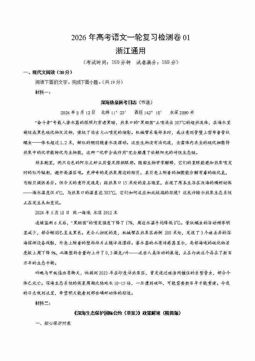 高考语文一轮复习检测卷01(浙江通用)(学生版)