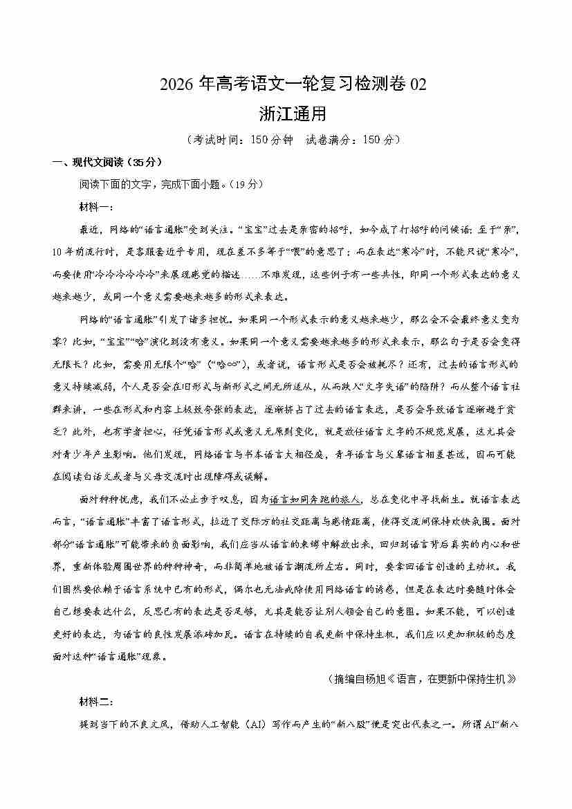 高考语文一轮复习检测卷02(浙江通用)(学生版)