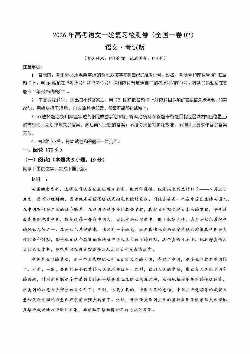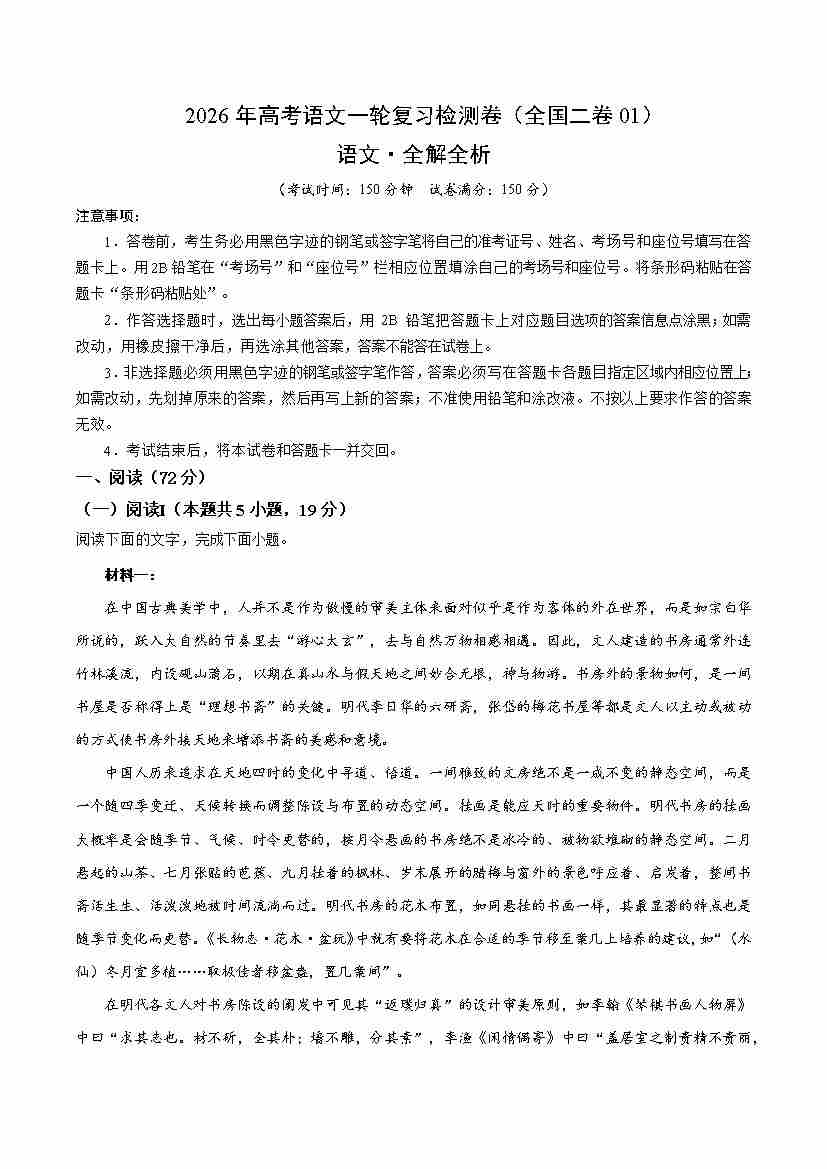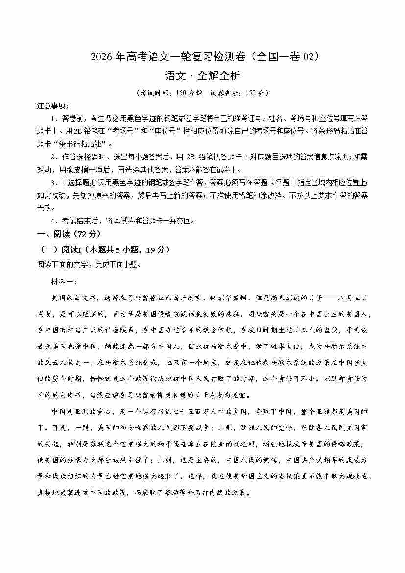 高考语文一轮复习检测卷(全国一卷02)(考试版)
