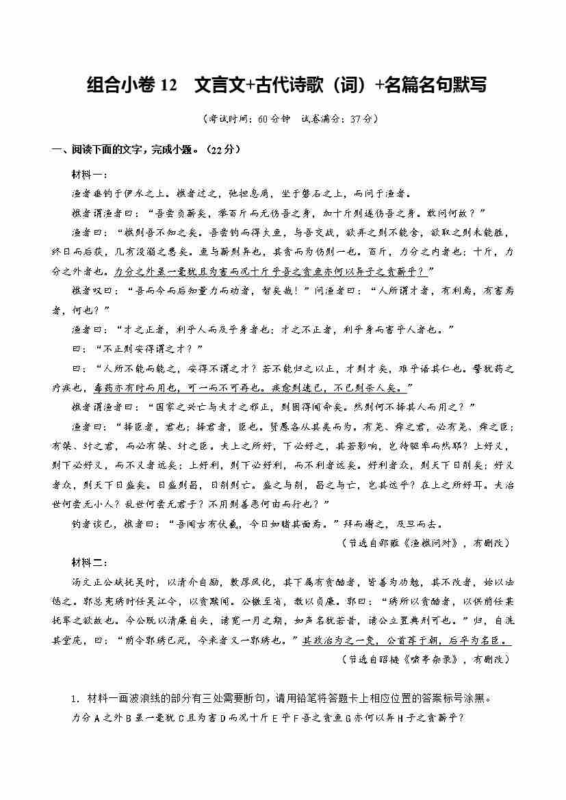 组合小卷12 文言文、古代诗歌(词)、名篇名句默写(全国通用)(教师版)