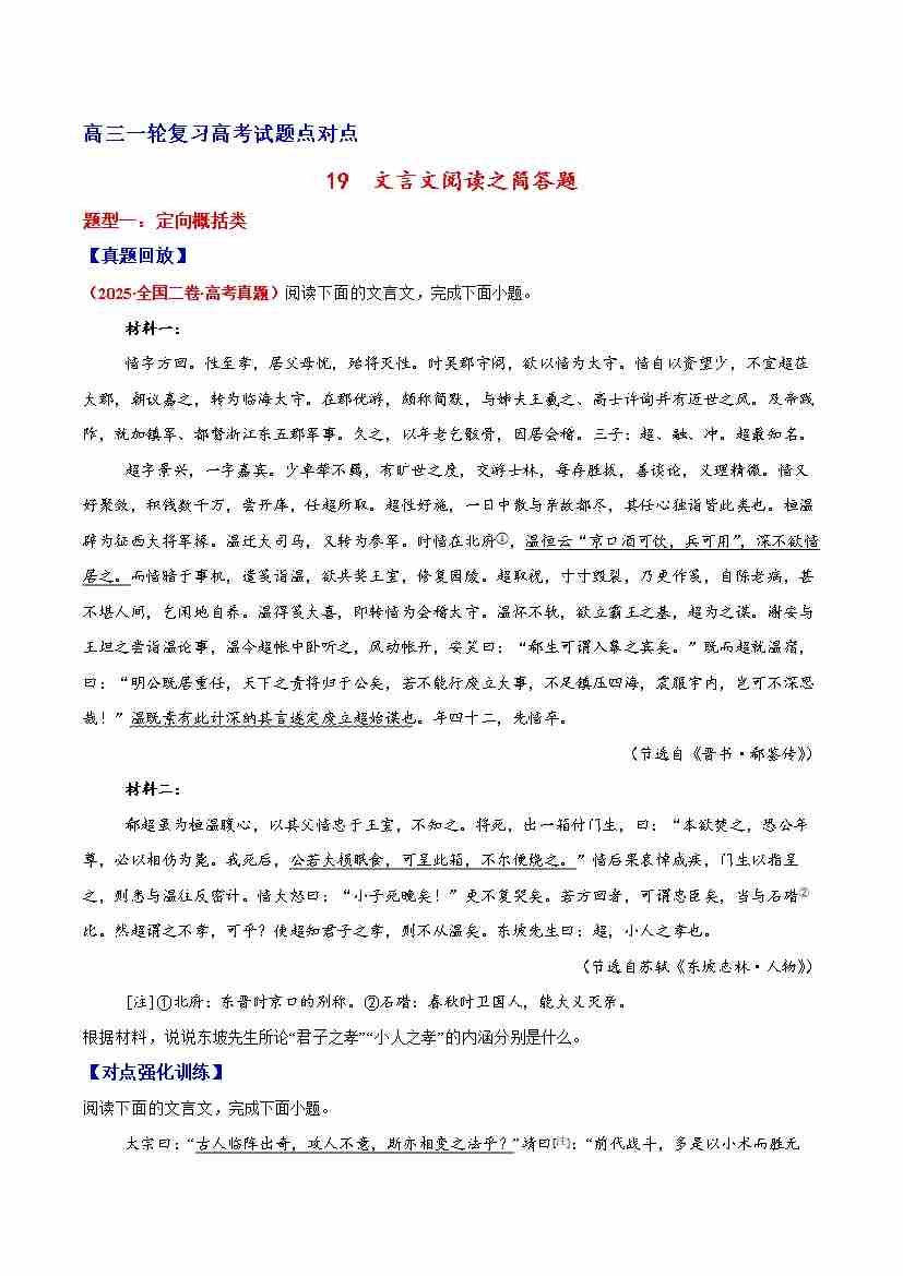 19 文言文阅读之简答题(原卷版)