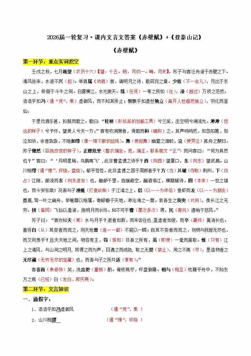 专题02 赤壁赋、登泰山记(文言文挖空训练)(全国通用)(答案版)