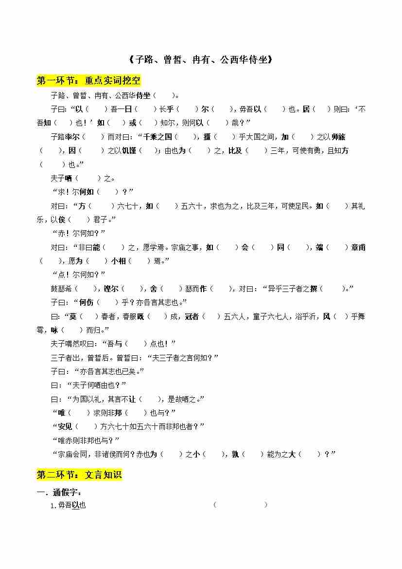 专题03 子路、曾皙、冉有、公西华侍坐、齐桓晋文之事(文言文挖空训练)(全国通用)(学生版)