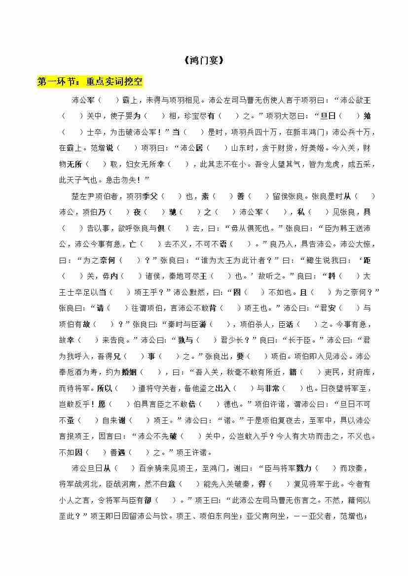 专题04 鸿门宴、谏逐客书(文言文挖空训练)(全国通用)(学生版)