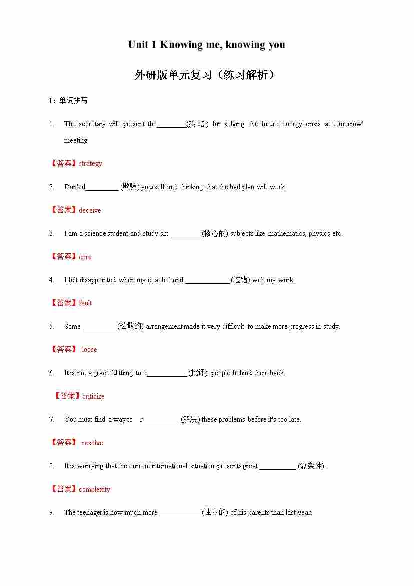 Unit 1 Knowing me, knowing you review 练习(1)(解析版)