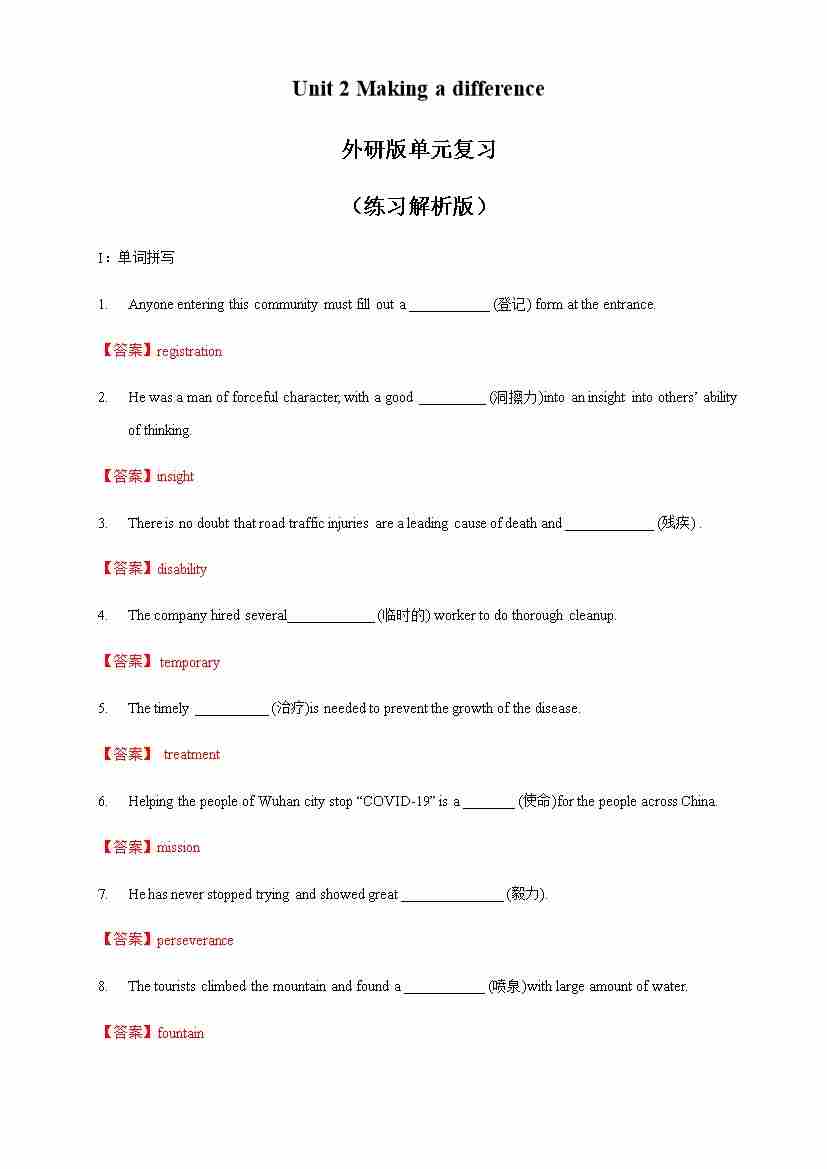 Unit 2 Making a difference review 练习(1)(解析版)